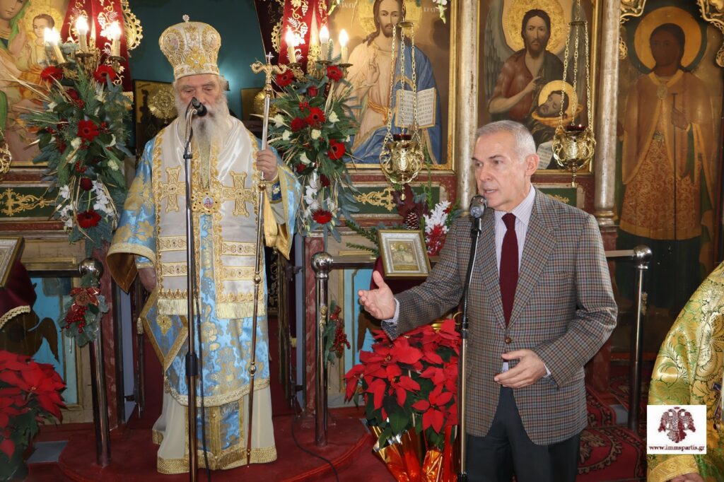 Από την πλευρά του, ο σεπτός Ποιμενάρχης κ. Ευστάθιος επαίνεσε τον π. Λάζαρο και τον κ. Δαβάκη για τις πρωτοβουλίες που ανέλαβαν, καθώς και όλους όσοι βοήθησαν με οποιονδήποτε τρόπο στην αποκατάσταση του ναού. Μάλιστα, τόνισε ότι «τέτοιες δυσκολίες τις επιτρέπει πολλές φορές ο Θεός για να ενεργοποιηθούν αδρανείς δυνάμεις και να για να ενωθεί μία κοινωνία κάτω από ένα κοινό σκοπό». Ιδιαίτερες ευχαριστίες εξέφρασε ο Ιεράρχης προς τον κ. Αθανάσιο Μαρτίνο, «που αποτελεί πολύτιμο στήριγμα, με το πολυποίκιλο φιλανθρωπικό έργο του», για το Οικουμενικό Πατριαρχείο, για άλλα Πατριαρχεία, την Εκκλησία της Ελλάδος, το Άγιο Όρος και άλλους φορείς. Μάλιστα, η τοπική Εκκλησία θα τιμήσει καταλλήλως τον κ. Μαρτίνο όταν ολοκληρωθεί και το μεγάλο έργο που έχει αναλάβει με αποκλειστική χορηγία του, αυτό της ανακαίνισης εσωτερικά και εξωτερικά του Μητροπολιτικού Ναού Ευαγγελιστρίας και της ανακαίνισης της Στέγης Νεότητας της ΙΜΜΣ.