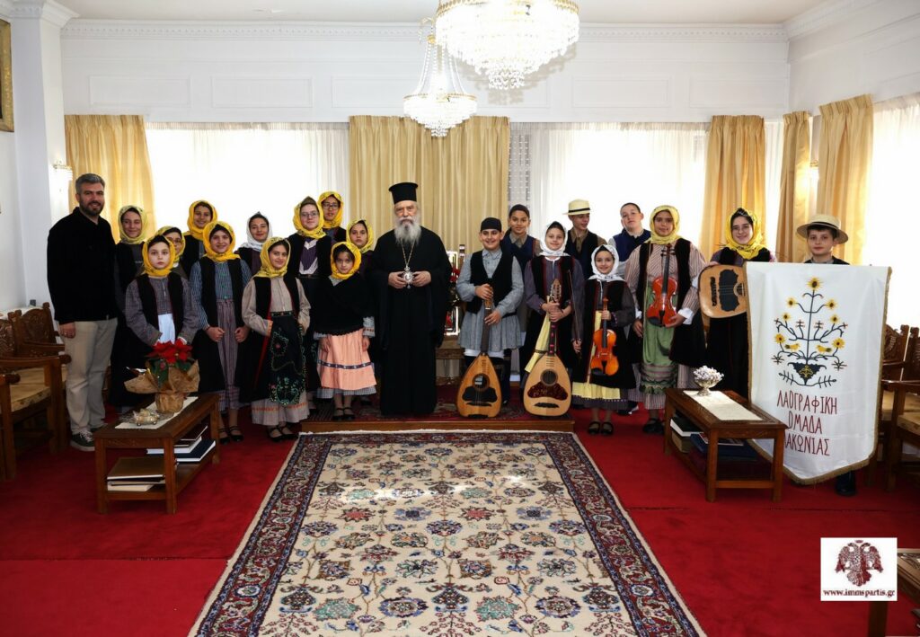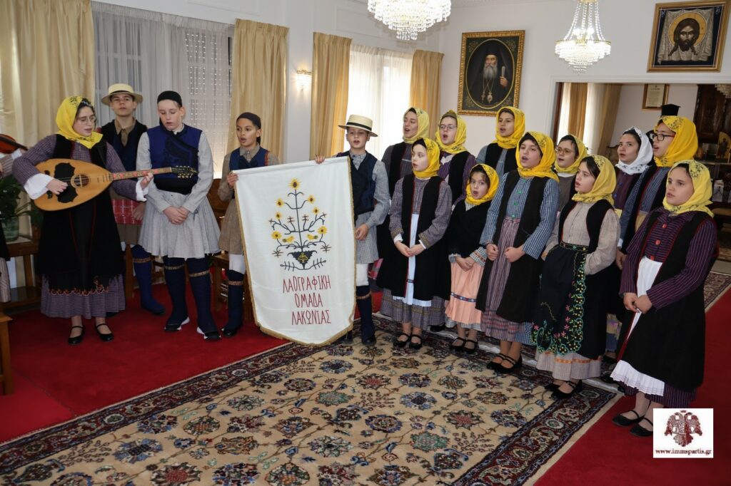 Την προηγούμενη ημέρα, τα κάλαντα έψαλαν παιδιά του Λαογραφικού Ομίλου Λακωνίας, που είναι ένας Πολιτιστικός Σύλλογος παραδοσιακών χορών που δραστηριοποιείται στη Σπάρτη. Τα παιδιά, ενδεδυμένα με παραδοσιακές φορεσιές και συνοδευόμενα από τον υπεύθυνο, κ. Νίκο Μπαριάμη, παρουσίασαν με εξαιρετικό τρόπο -και συνοδεία παραδοσιακών οργάνων- κάλαντα από την Ρειχιά και τα Πιστάματα Ζάρακος, καθώς και από τις Καρυές του Πάρνωνα. Ο σεβασμιώτατος συνεχάρη τα παιδιά και τον Ν. Μπαριάμη για την αξιέπαινη παρουσία τους, υπογράμμισε «την αξία της διατήρησης των εθίμων και της παράδοσης του τόπου μας», ενώ τους ευχήθηκε «να πορεύονται πάντα στον δρόμο της αρετής και της μάθησης».
