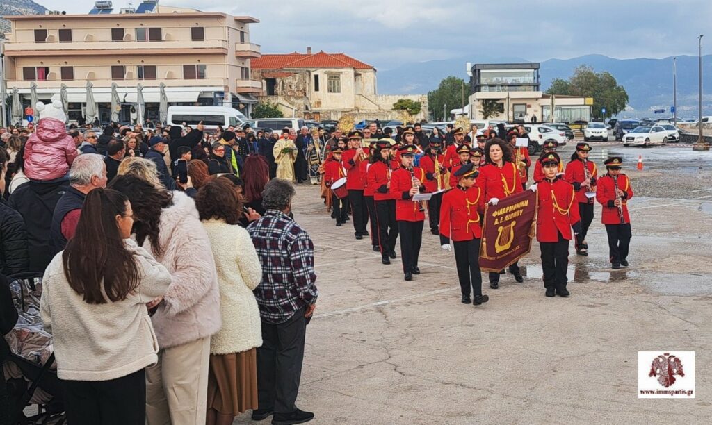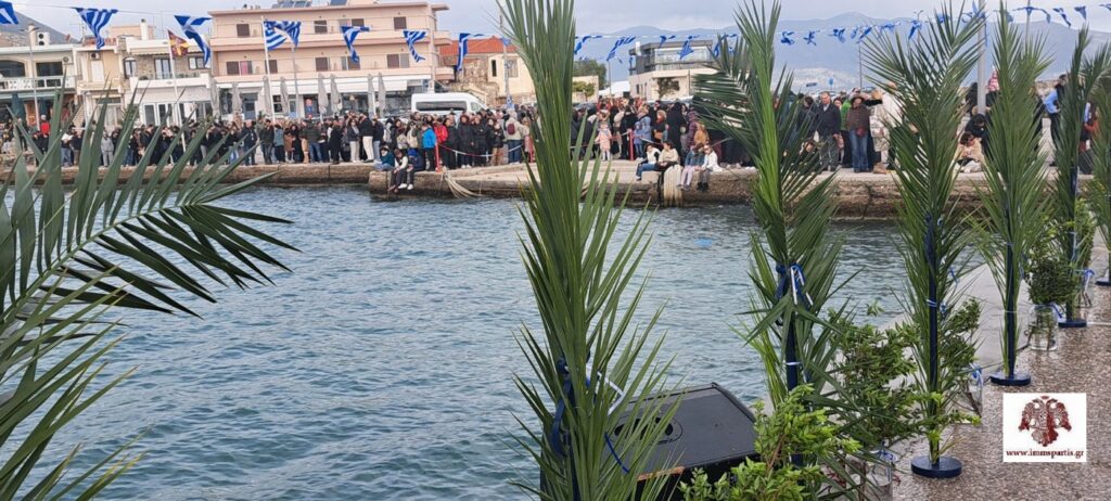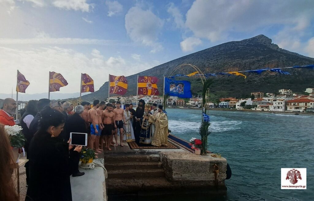 Μετά την Απόλυση, προπορευόμενης της Φιλαρμονικής και των ιερών λαβάρων, σχηματίσθηκε λιτανευτική πομπή έως το λιμάνι της πόλης, όπου τελέσθηκε ο Αγιασμός των υδάτων και η κατάδυση του Τιμίου Σταυρού από τον σεβασμιώτατο, ενώπιον πλήθους πιστών από την ευρύτερη περιοχή της Λακωνίας.