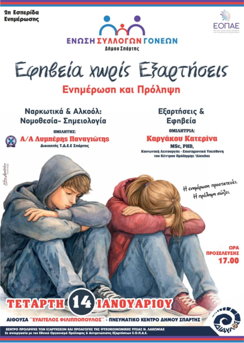 Με στόχο την ενημέρωση, την ευαισθητοποίηση και την ενίσχυση της πρόληψης γύρω από το κρίσιμο ζήτημα των εξαρτήσεων, η Ένωση Συλλόγων Γονέων Δήμου Σπάρτης διοργανώνει τη 2η Ενημερωτική Συνάντηση με τίτλο «Εφηβεία χωρίς Εξαρτήσεις – Ενημέρωση και Πρόληψη». Η εκδήλωση πραγματοποιείται την Τετάρτη 14 Ιανουαρίου, στις 17:00, στην αίθουσα «Ευάγγελος Φιλιππόπουλος» του Πνευματικού Κέντρου του Δήμου Σπάρτης.