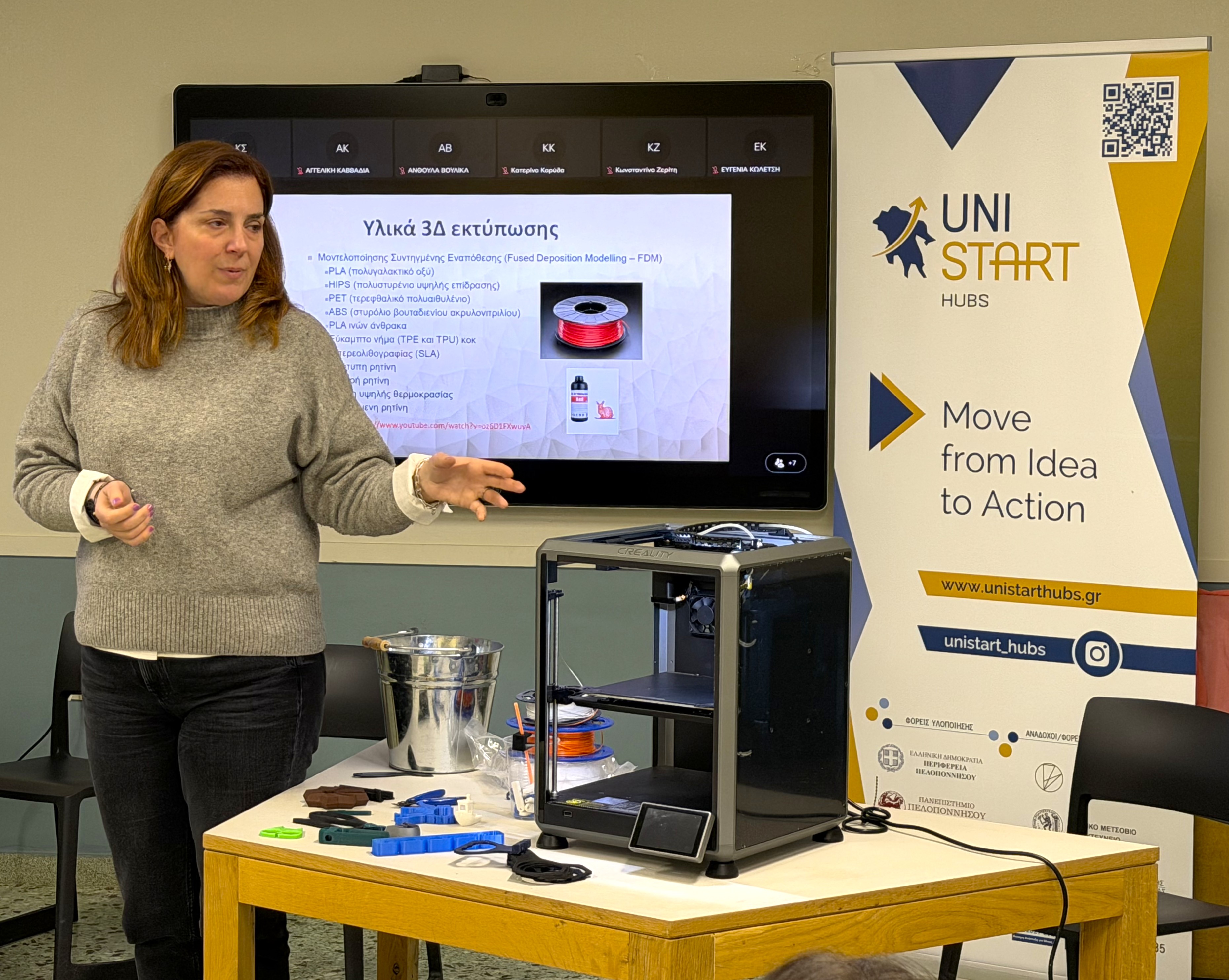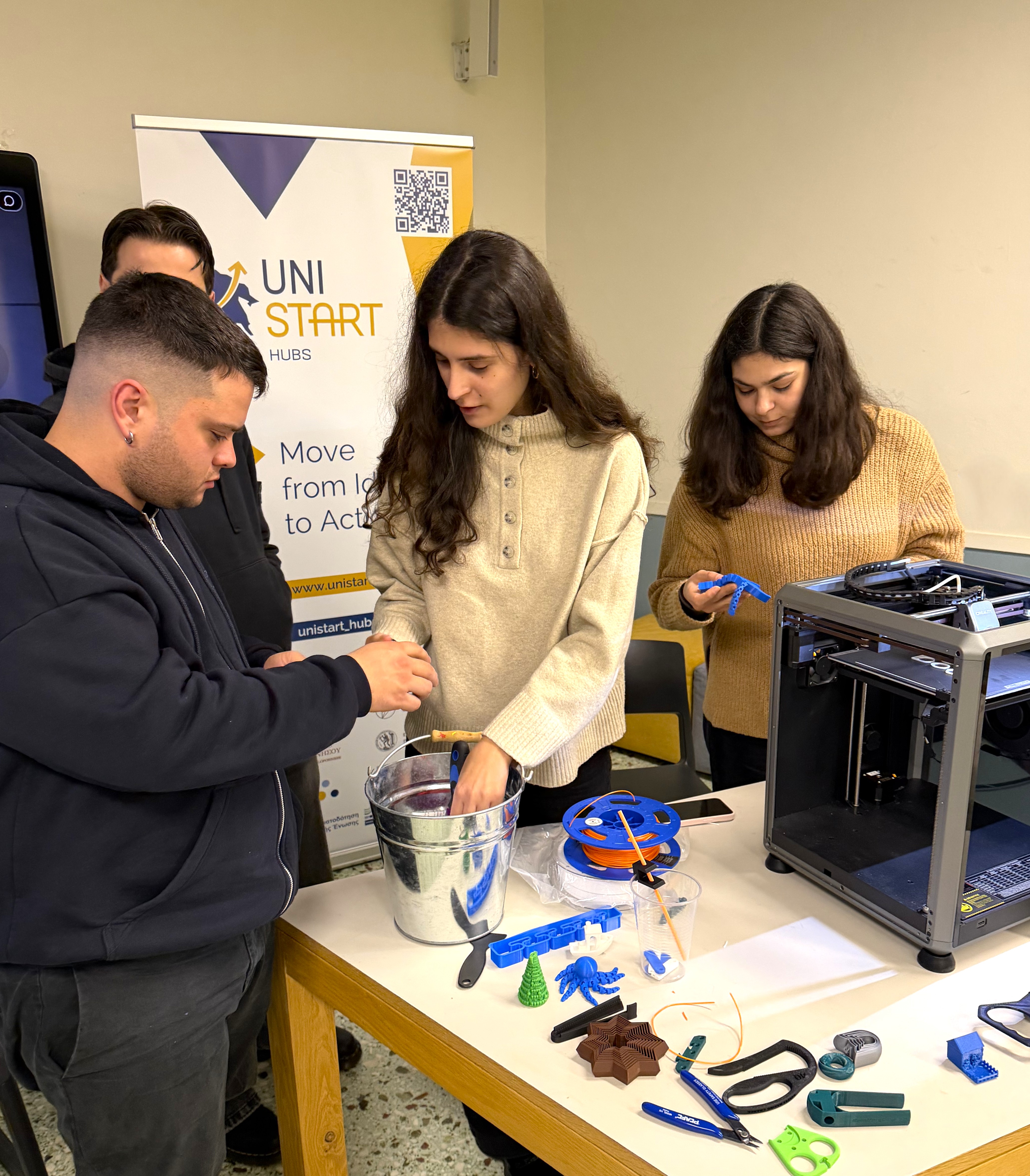 Στο ίδιο πλαίσιο υλοποιήθηκε και δράση εξοικείωσης με τον ειδικό εργαστηριακό εξοπλισμό των UniStart Hubs, με έμφαση στη χρήση τρισδιάστατης εκτύπωσης (3D printing). Οι συμμετέχοντες γνώρισαν πρακτικές εφαρμογές της τεχνολογίας σε εκπαιδευτικά και επιχειρηματικά σενάρια, ενισχύοντας τη βιωματική και πρακτική διάσταση των δράσεων.