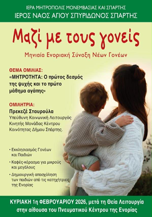 Μια ιδιαίτερα ουσιαστική και ανθρώπινη πρωτοβουλία απευθυνόμενη σε νέους γονείς φιλοξενεί η Ενορία του Ιερού Ναού Αγίου Σπυρίδωνος Σπάρτης, στο πλαίσιο της μηνιαίας ενοριακής σύναξης με τίτλο «Μαζί με τους γονείς».