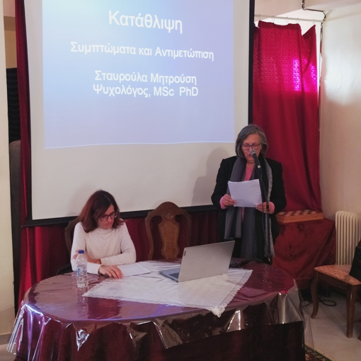Με σαφή και εμπεριστατωμένο επιστημονικό λόγο, αλλά και με πρακτικά παραδείγματα από την καθημερινότητα, η ομιλήτρια ανέλυσε τη σύγχρονη «μάστιγα» της κατάθλιψης, επισημαίνοντας πόσο σημαντική είναι η έγκαιρη αναγνώριση των συμπτωμάτων και η σωστή αντιμετώπιση τόσο από τους ειδικούς επιστήμονες όσο και από το οικογενειακό περιβάλλον.