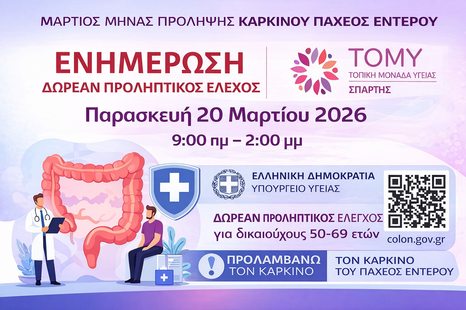 Με αφορμή τον Μάρτιο, που έχει καθιερωθεί ως μήνας πρόληψης για τον καρκίνο του παχέος εντέρου, η Τοπική Μονάδα Υγείας (ΤΟΜΥ) Σπάρτης αναλαμβάνει πρωτοβουλία ενημέρωσης και ευαισθητοποίησης των πολιτών, διοργανώνοντας δράση πρόληψης την Παρασκευή 20 Μαρτίου.