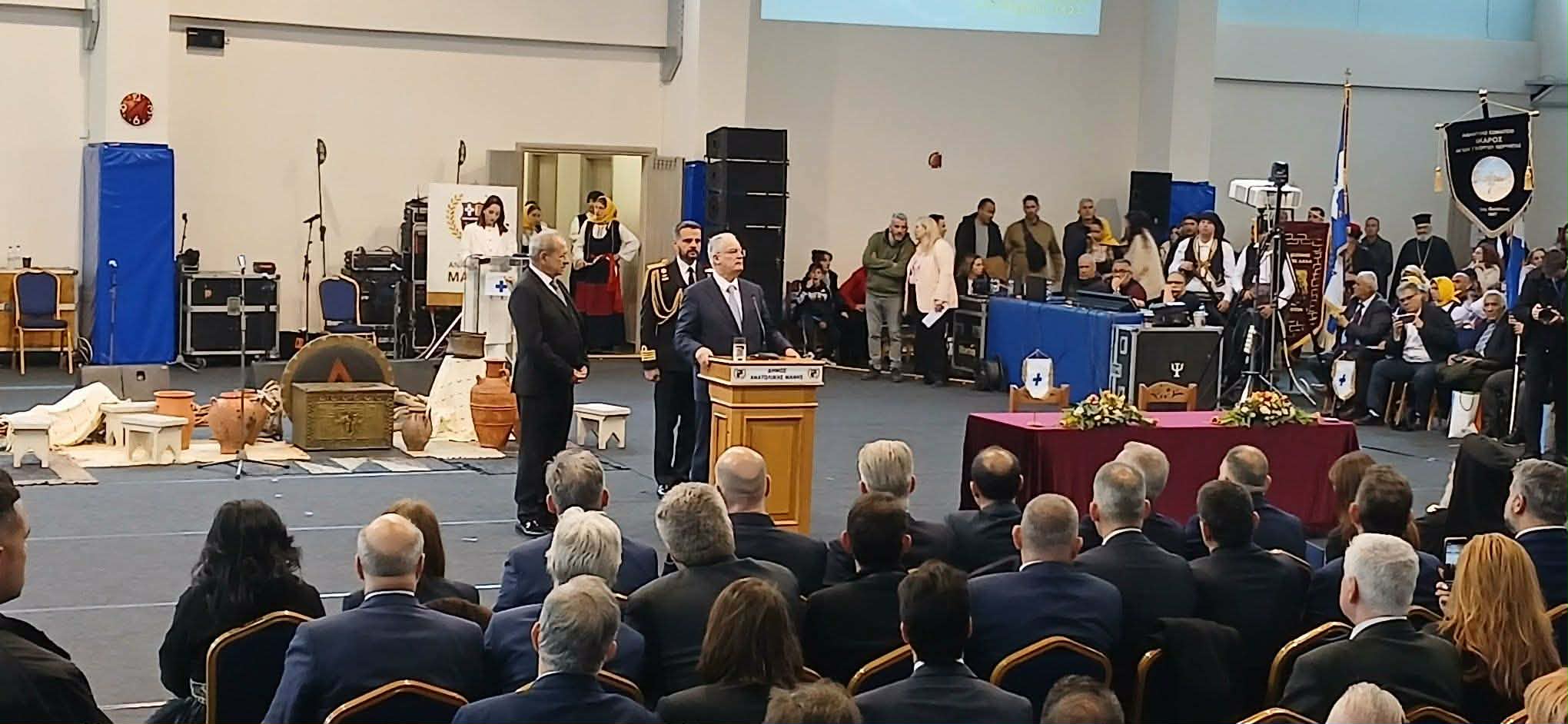 Λόγω των δυσμενών καιρικών συνθηκών, το μεγαλύτερο μέρος των εκδηλώσεων μεταφέρθηκε στο Κλειστό Γυμναστήριο Αρεόπολης. Εκεί, ο δήμαρχος Ανατολικής Μάνης Πέτρος Ανδρεάκος καλωσόρισε τον Πρόεδρο της Δημοκρατίας, ανακηρύσσοντας τον επίτιμο δημότη Ανατολικής Μάνης, με την απονομή του «χρυσού κλειδιού» του δήμου, κατόπιν ομόφωνης απόφασης του Δημοτικού Συμβουλίου.