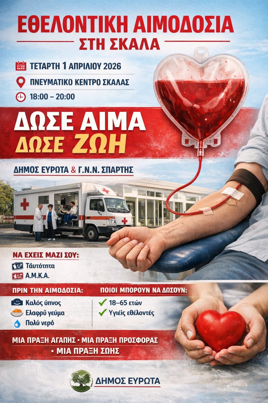 Με ένα ισχυρό μήνυμα αλληλεγγύης και προσφοράς προς τον συνάνθρωπο, ο Δήμος Ευρώτα προχωρά στη διοργάνωση εθελοντικής αιμοδοσίας στη Σκάλα, καλώντας τους πολίτες να συμμετάσχουν ενεργά σε μια πράξη ουσιαστικής ανθρωπιάς.