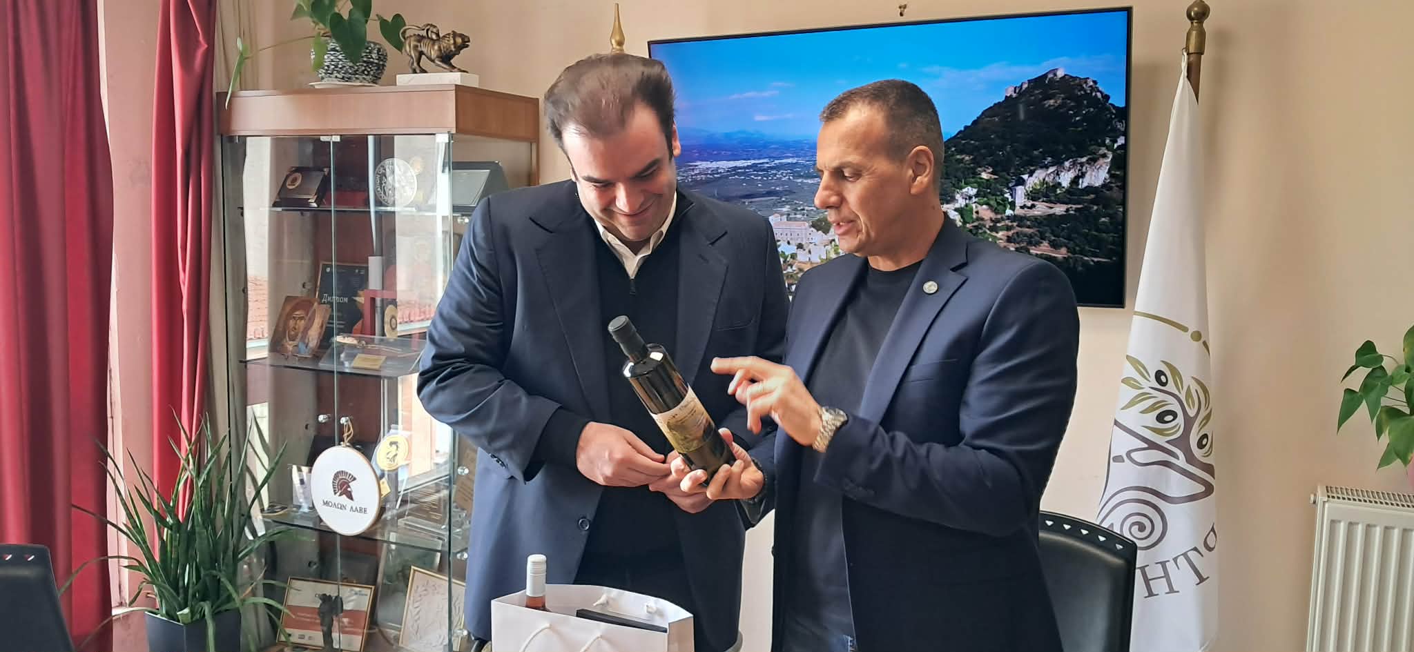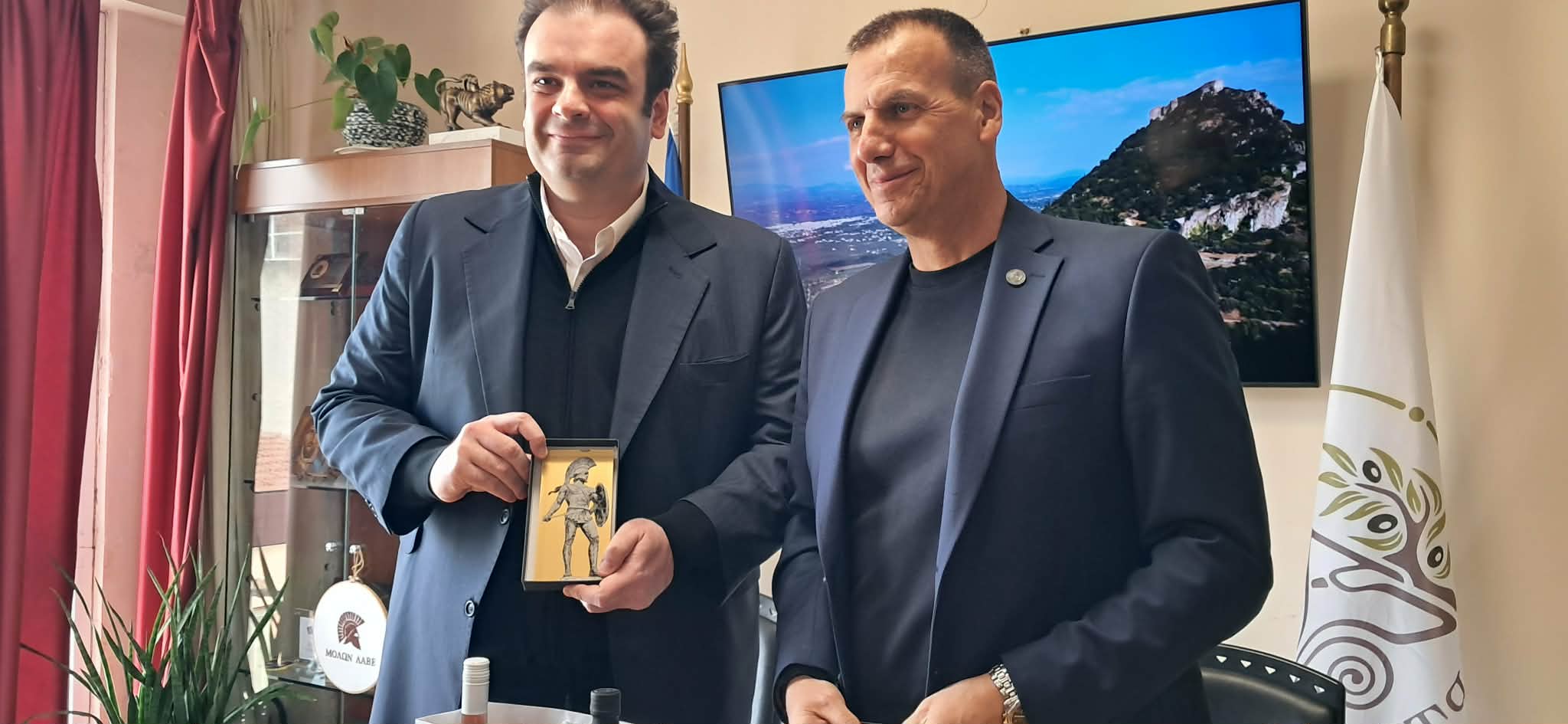 Αμέσως μετά, ο δήμαρχος προσέφερε στον υπουργό Οικονομίας & Οικονομικών δώρα, όπως το έμβλημα του δήμου, του βασιλιά Λεωνίδα, του πολιούχου της Σπάρτης, Οσίου Νίκωνος του Μετανοείτε, καθώς και κρασί από τον Ταΰγετο, αλλά και ελαιόλαδο που παρήγαγε ο δήμος από το ιδιόκτητο κτήμα Πανδώρα στον Μυστρά.