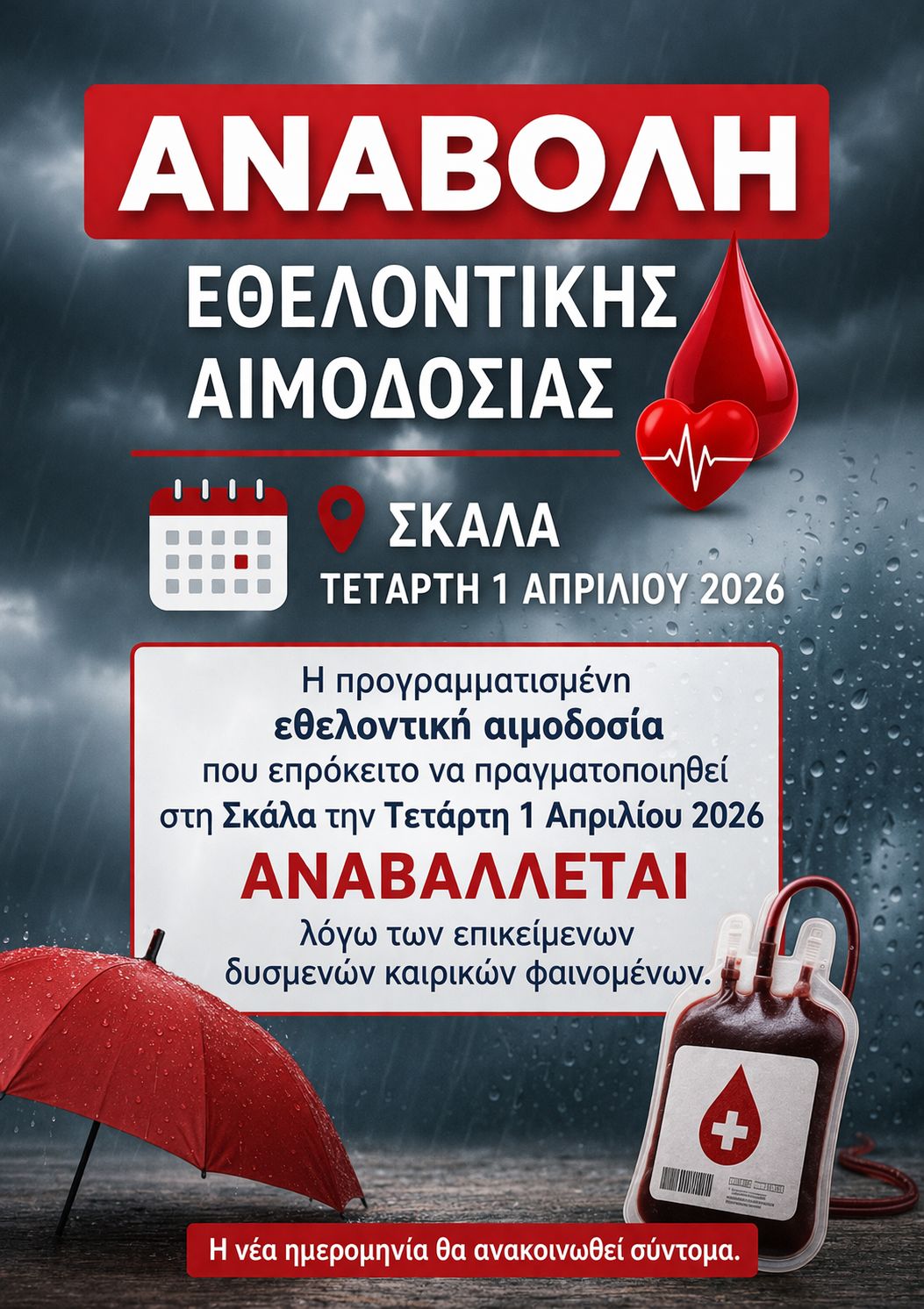 Σε αναβολή οδηγείται η προγραμματισμένη εθελοντική αιμοδοσία που επρόκειτο να πραγματοποιηθεί την Τετάρτη 1 Απριλίου στη Σκάλα, εξαιτίας των δυσμενών καιρικών συνθηκών που αναμένεται να πλήξουν την περιοχή.