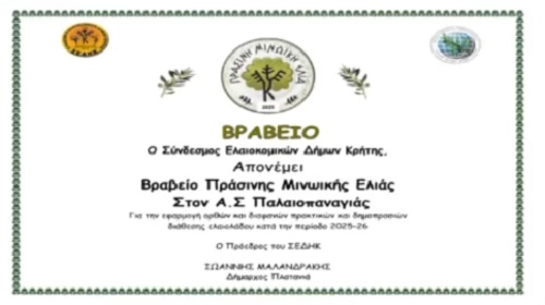 Ο Αγροτικός Συνεταιρισμός Παλαιοπαναγιάς συνεχίζει να ξεχωρίζει για την ποιότητα και τη συνέπεια της δραστηριότητάς του, κατακτώντας ακόμη μία σημαντική διάκριση στον χώρο της ελαιουργίας. Αυτή τη φορά, ο συνεταιρισμός τιμήθηκε με το Βραβείο Πράσινης Μινωικής Ελιάς από τον Σύνδεσμο Ελαιοκομικών Δήμων Κρήτης (ΣΕΔΗΚ), για την εφαρμογή ορθών και διαφανών πρακτικών στη διαδικασία δημοπρασιών διάθεσης ελαιολάδου κατά την ελαιοκομική περίοδο 2025-2026.