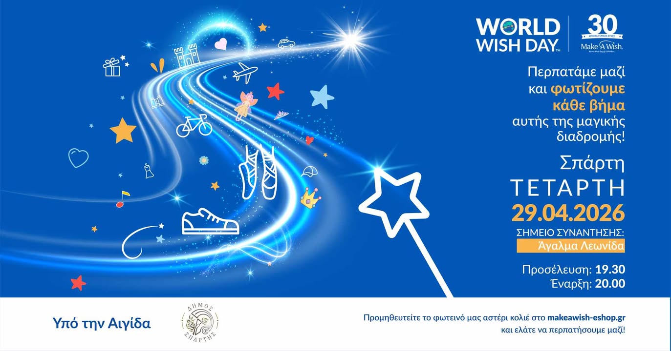 Με ένα μήνυμα ελπίδας, προσφοράς και αλληλεγγύης, η Σπάρτη ετοιμάζεται να συμμετάσχει ενεργά στον εορτασμό του World Wish Day 2026, στέλνοντας ένα φωτεινό μήνυμα στήριξης στα παιδιά που έχουν ανάγκη.