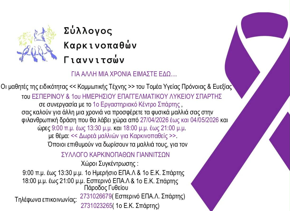 Οι μαθητές της ειδικότητας «Κομμωτικής Τέχνης» του Τομέα Υγείας, Πρόνοιας και Ευεξίας του Εσπερινού και 1ου Ημερήσιου Επαγγελματικού Λυκείου Σπάρτης, σε συνεργασία με το 1ο Εργαστηριακό Κέντρο Σπάρτης, διοργανώνουν φιλανθρωπική δράση με θέμα «Δωρεά μαλλιών για καρκινοπαθείς».