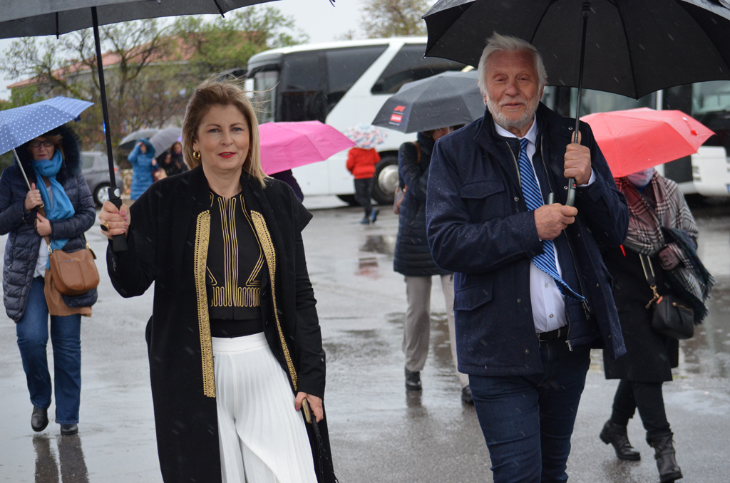 Με ένα κομψό σύνολο που περιελάμβανε στοιχεία από παραδοσιακή φορεσιά και λεπτομέρειες ταιριαστές με την ημέρα, η ενδυματολογική επιλογή της κ. Σπυριδάκου δεν επισκιάστηκε σε τίποτα από την ομπρέλα που επέβαλε ο καιρός.
