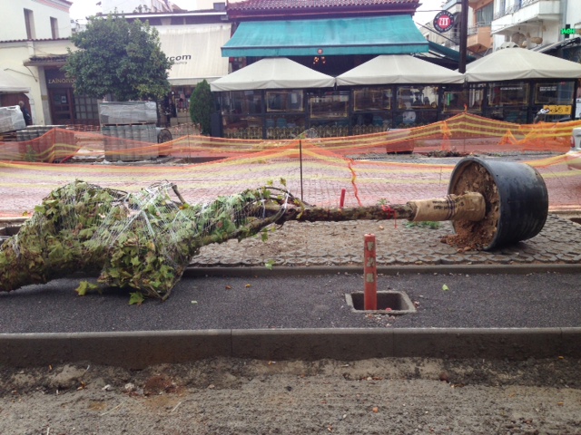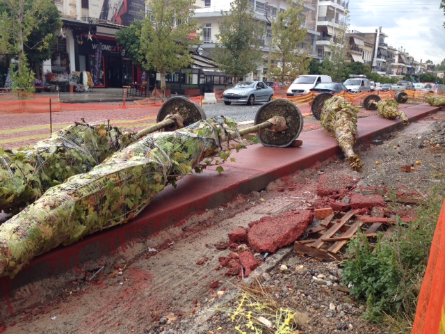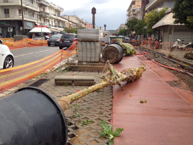Νεράκι αρκετό κι ευχάριστο για να ποτιστούν οι ελιές κι οι καρποί έφερε και η σημερινή (15/11) βροχούλα, στη Σπάρτη. Μαζί όμως έφερε και καμμιά 30αριά πλατάνια και τα προσγείωσε στο κέντρο της πόλης, στην Παλαιολόγου, στην ανάπλαση. Χάζι έκαναν οι περαστικοί από το πρωί, τα συνεργεία της αναδόχου εταιρείας που ξεφόρτωναν τα πλατάνια και τα άφηναν ξάπλα, μαζί με τους γλάστρες τους, στο μεσαίο τμήμα Κων/νου Παλαιολόγου, ανάμεσα στις οδούς Ευαγγελιστρίας και Βρασίδου. «Τι μας βρήκε πάλι;», αναρωτήθηκαν πολλοί. Και προφανώς, αυτό που συμβαίνει είναι πως ο ανάδοχος της ανάπλασης παίρνει τα μέτρα του, ενόψει της συνεδρίασης του Τεχνικού Συμβουλίου της Αποκεντρωμένης. «Παλιά του τέχνη κόσκινο».