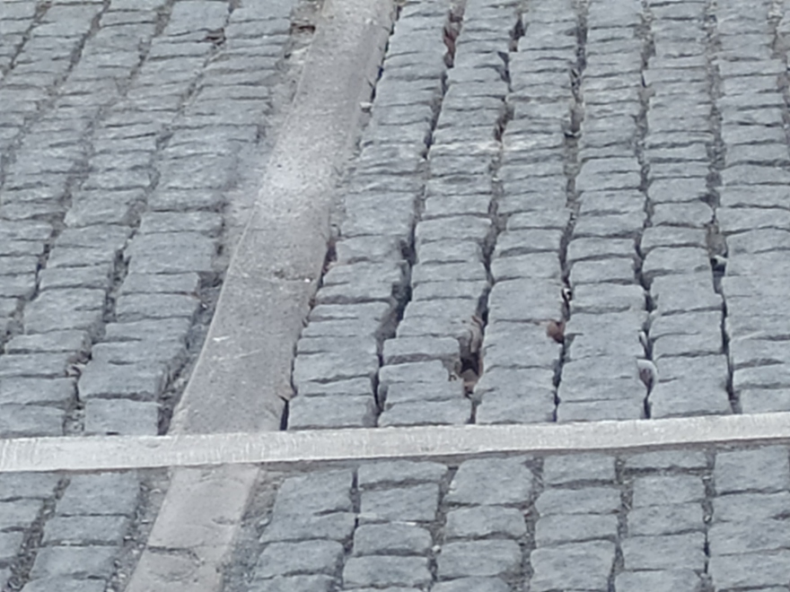 Διότι, αφού τα αυτοκίνητα καταφέρουν, με κραδασμό, να περάσουν τις σχάρες, συνεχίζουν να κινούνται σε διαρκή οδική διαταραχή, αφού το νέο κατάστρωμα της οδού είναι κακοτράχαλο, σε κάποια σημεία του έχει υποχωρήσει δημιουργώντας, λακκούβες και οι κυβόλιθοι είναι έτοιμοι να φύγουν από τη θέση τους, προοιωνίζοντας πως δεν είναι μακριά η ώρα που το έργο με τους κυβόλιθους θα ξηλωθεί ολόκληρο για να ξαναστρωθεί.
