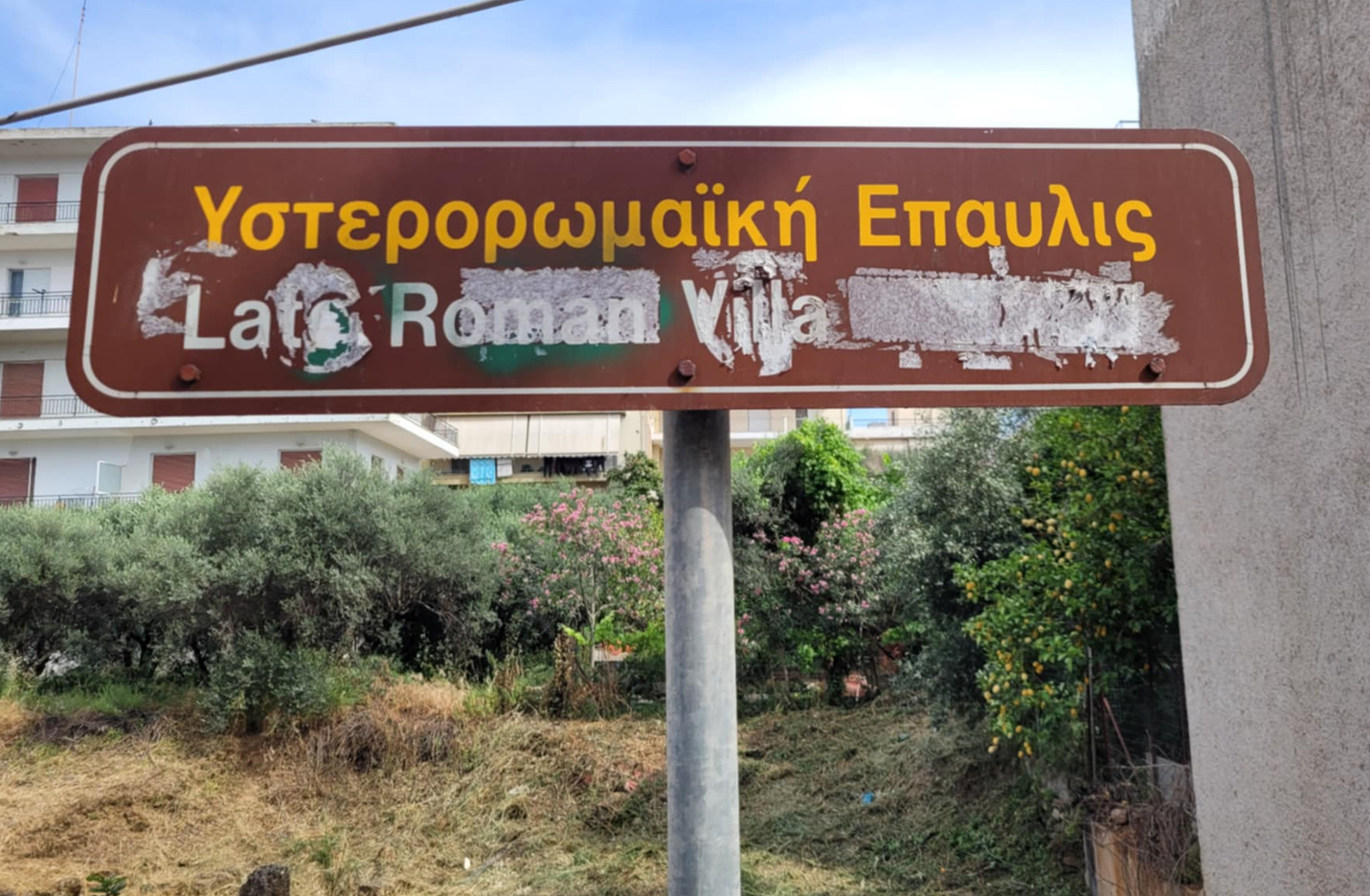 Και μια ακόμα σημαντική «λεπτομέρεια»: Ευπρόσδεκτος βεβαίως ο καθαρισμός, όμως ακόμη και μετά την αποψίλωση, ο επισκέπτης αντικρίζει μια φθαρμένη, σχεδόν «βανδαλισμένη» πινακίδα, με την αγγλική μετάφραση να έχει καλυφθεί από αυτοκόλλητα.