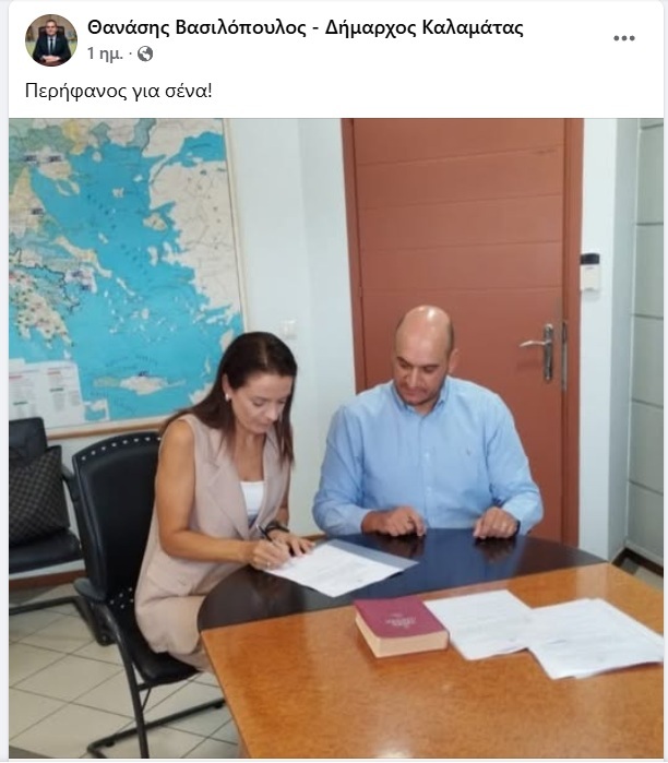 «Περήφανος για σένα!». Με αυτό το λακωνικό μήνυμα συνόδεψε φωτογραφία της συζύγου του, Εύης Παπαγεωργίου, σε ανάρτηση που έκανε ο δήμαρχος Καλαμάτας και πρόεδρος της ΠΕΔ Πελοποννήσου, Θανάσης Βασιλόπουλος.