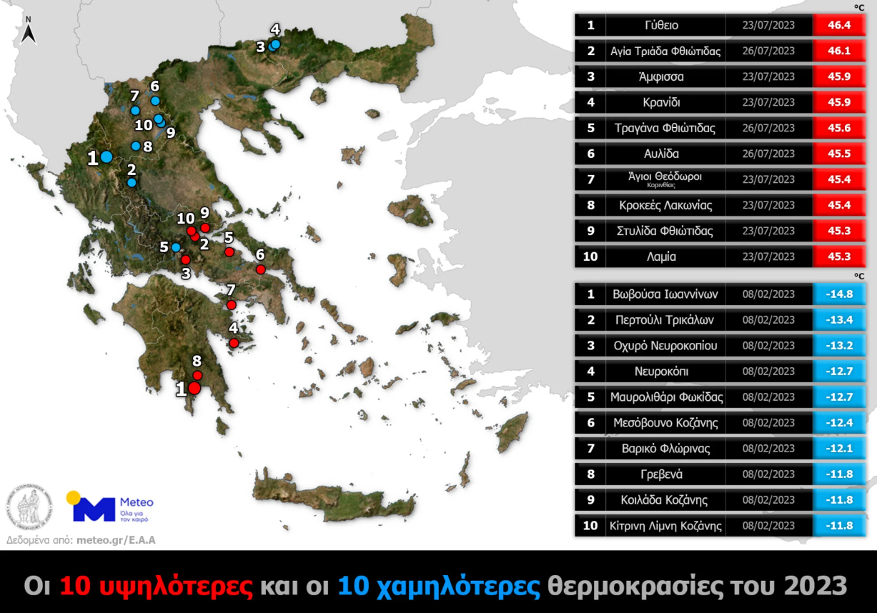 Στο Γύθειο Λακωνίας καταγράφηκε η υψηλότερη θερμοκρασία για το 2023, ενώ αντίστοιχα, η χαμηλότερη θερμοκρασία σημειώθηκε στη Βωβούσα Ιωαννίνων, σύμφωνα με το meteo.