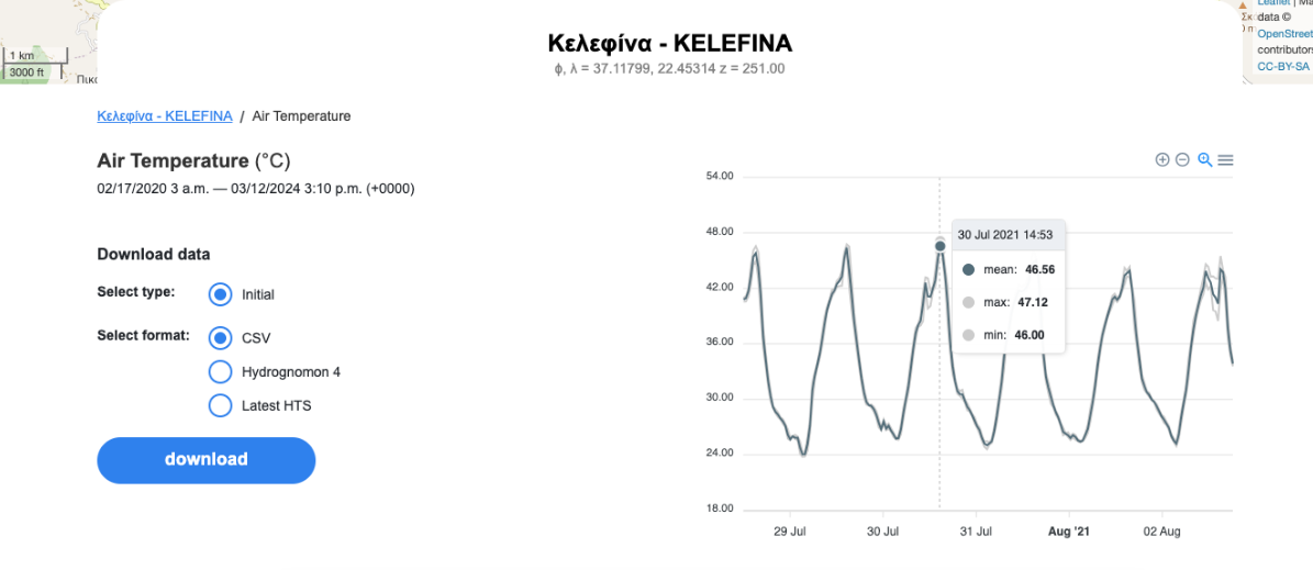 Πιο συγκεκριμένα, στις 3/8/2021 ο σταθμός (ΕΑΑ) του Ευρώτα που έχει εγκατασταθεί στο ύψος του Καραβά βορειοδυτικά της Σπάρτης, κατέγραψε την τιμή ρεκόρ για τη Λακωνία με 47.4°C. Αντίστοιχα, την ίδια περίοδο του μεγάλου καύσωνα Ιουλίου/Αυγούστου 2021, ο δεύτερος υδρομετεωρολογικός σταθμός του ΕΑΑ στην τοποθεσία Κελεφίνας μέτρησε 47.1°C.
