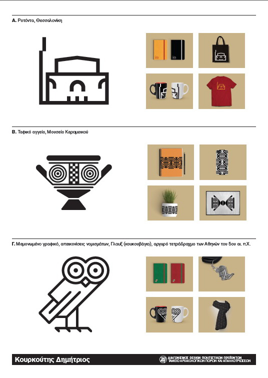 Οι διαγωνιζόμενοι διατύπωσαν τρείς γραφιστικές προτάσεις, εμπνευσμένες από διάφορες ιστορικές περιόδους και απέδωσαν με ευαισθησία και μια αφαιρετική προσέγγιση, εικόνες πάνω σε επιλεγμένα χρηστικά αντικείμενα. Το πρωτοφανές αυτό αποτέλεσμα δείχνει εντυπωσιακό για τα δεδομένα των πωλητηρίων στα ελληνικά δημόσια μουσεία και τους αρχαιολογικούς χώρους.