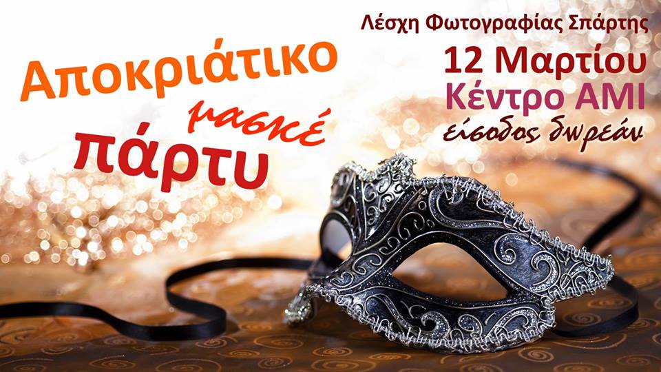 22.00 | Αποκριάτικο μασκέ πάρτυ από τη Λέσχη Φωτογραφίας Σπάρτης στο κέντρο ΑΜΙ (πλατεία Μαγούλας). Είσοδος ελεύθερη. Ζωντανή μουσική από τις "Λαϊκές Νότες".