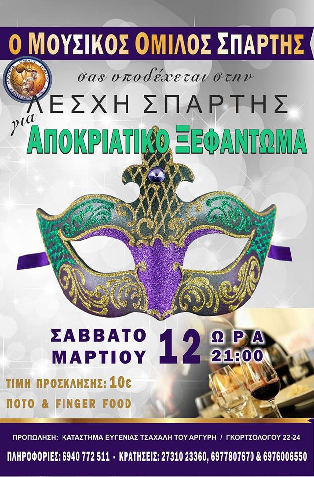 21.00 | Αποκριάτικο event από το Μουσικό Όμιλο Σπάρτης, στη Λέσχη Σπάρτης - ''Σύμμετρον'' (κεντρική πλατεία). Τιμή πρόσκλησης: 10€
