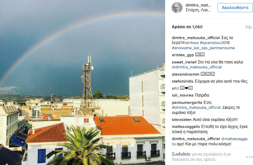 Επίσης, η Δ. Ματσούκα ανέβασε μία φωτογραφία με το ουράνιο τόξο να απλώνεται πάνω από τον ουρανό της λακωνικής πρωτεύουσας, όταν πια είχε κοπάσει η βροχή…