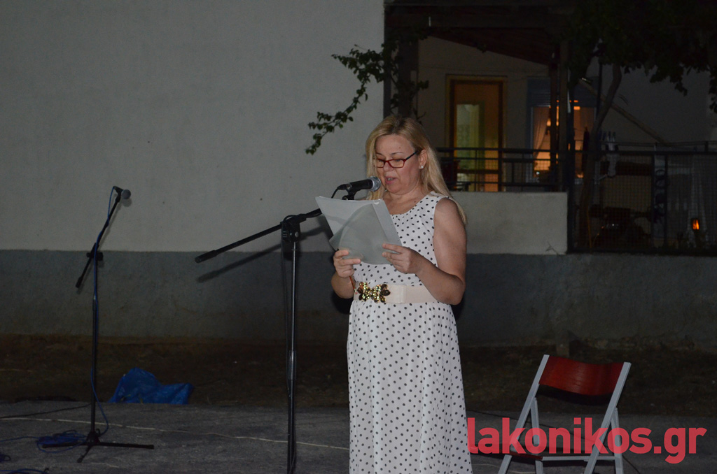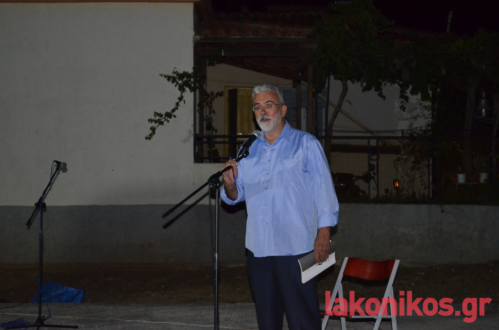 Το κεντρικό πρόσωπο της βραδιάς, ο συγγραφέας Γιώργος Ανωγειάτης, παίρνοντας τη σκυτάλη, συγκινημένος από τα λόγια των κκ Δαράκη και Κακαλέτρη, ανέφερε: «Η σκέψη όλων μας αγκαλιάζει τους πυρόπληκτους όλης της χώρας, ιδιαίτερα της Μάνης, που έχασαν σπίτια, χωράφια, περιουσίες, δουλειές. Ας ελπίσουμε πως τα βάσανά τους θα τελειώσουν σύντομα, όσο αυτό είναι δυνατό και πως θ’ ανατείλουν καλύτερες μέρες γι’ αυτούς…»