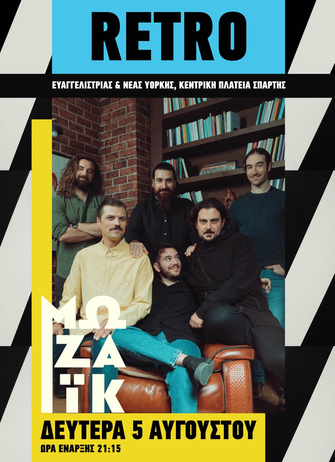 Οι ΜΩΖΑΪΚ, η μπάντα που γνωρίσαμε και αγαπήσαμε μέσα από το “Μουσικό Κουτί” της ΕΡΤ1, με τις sold out εμφανίσεις σε όλη την Ελλάδα, έρχονται ξανά στο RETRO MUSIC BAR στην πλατεία της Σπάρτης, τη Δευτέρα 5 Αυγούστου.
