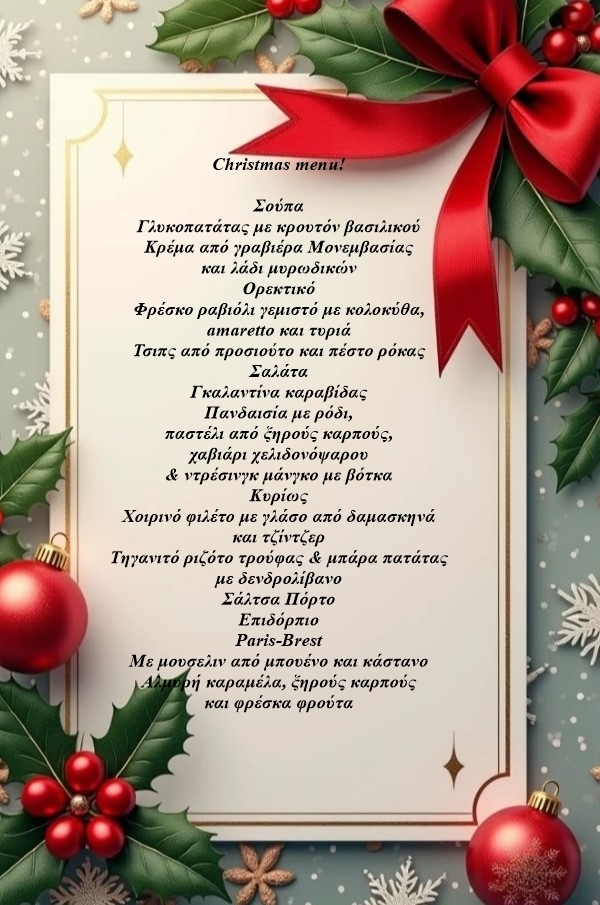 | 24 Δεκεμβρίου 2024, με ζωντανή μουσική και ειδικό μενού ενηλίκων και παιδικό