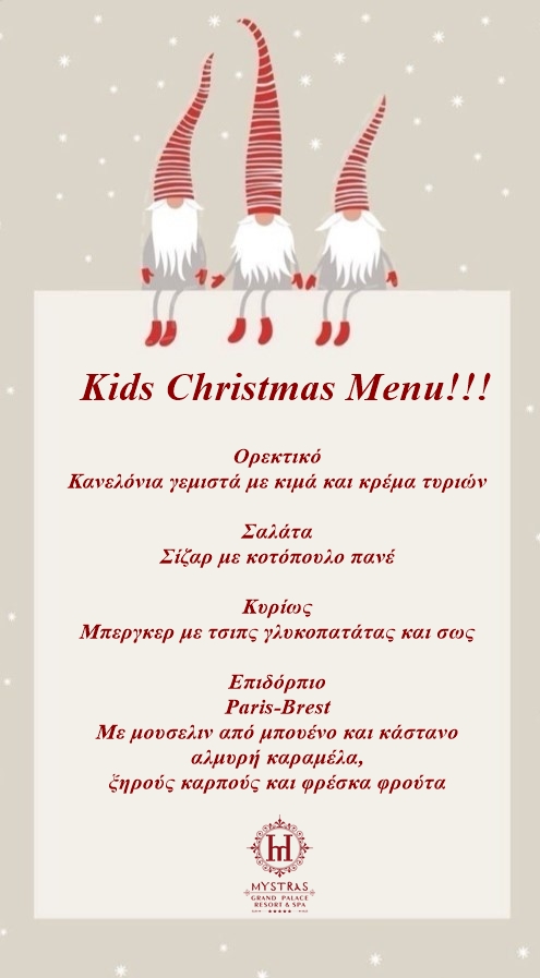 Στο Mystras Grand Palace Resort & Spa τα Χριστουγεννιάτικα μενού είναι έτοιμα, διαμορφωμένα για μικρούς και μεγάλους. Σας προσκαλούμε να απολαύσετε τα μοναδικά πιάτα, δημιουργημένα με φροντίδα και έμπνευση.