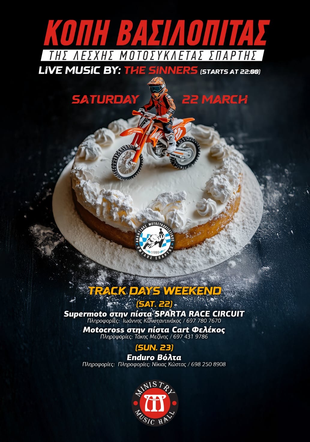 Το Σάββατο (22/3) και ώρα 8 το βράδυ, ο όμιλος θα πραγματοποιήσει την κοπή της βασιλόπιτάς του στο Ministry Music Hall, με live μουσική από τους «The Sinners», σε μια βραδιά που δεν πρέπει να χάσει κανείς!