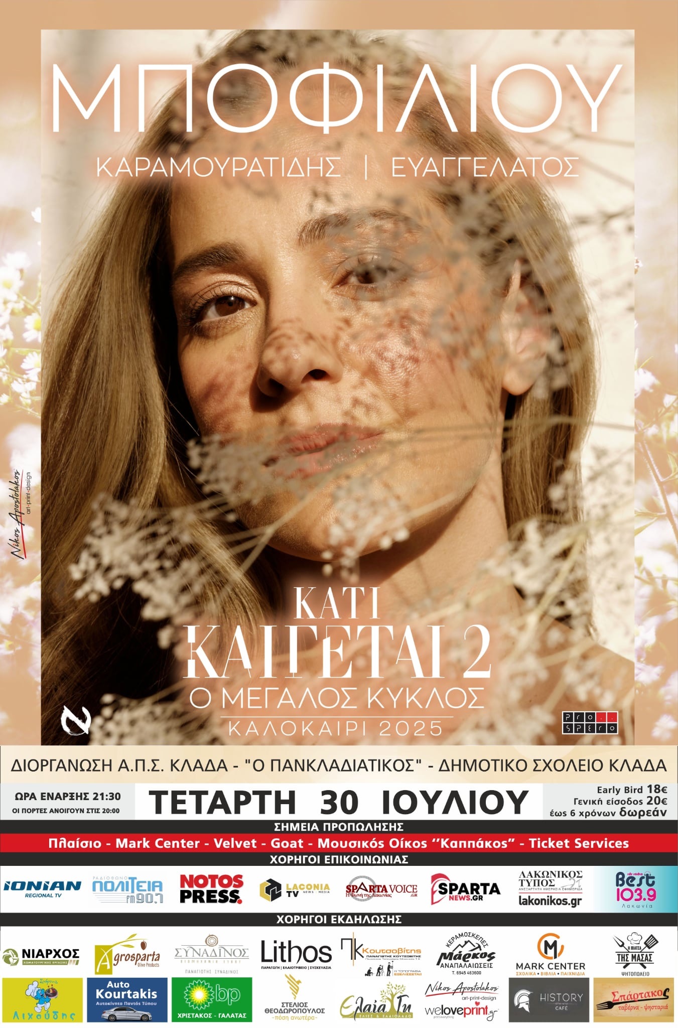Η προπώληση των εισιτηρίων για τη μεγάλη συναυλία στον Κλαδά έχει ξεκινήσει, με γενική είσοδο 20 ευρώ και early bird στα 18 ευρώ (συγκεκριμένος αριθμός εισιτηρίων μέχρι την εξάντλησή τους). Παιδιά έως 6 ετών έχουν δωρεάν είσοδο.