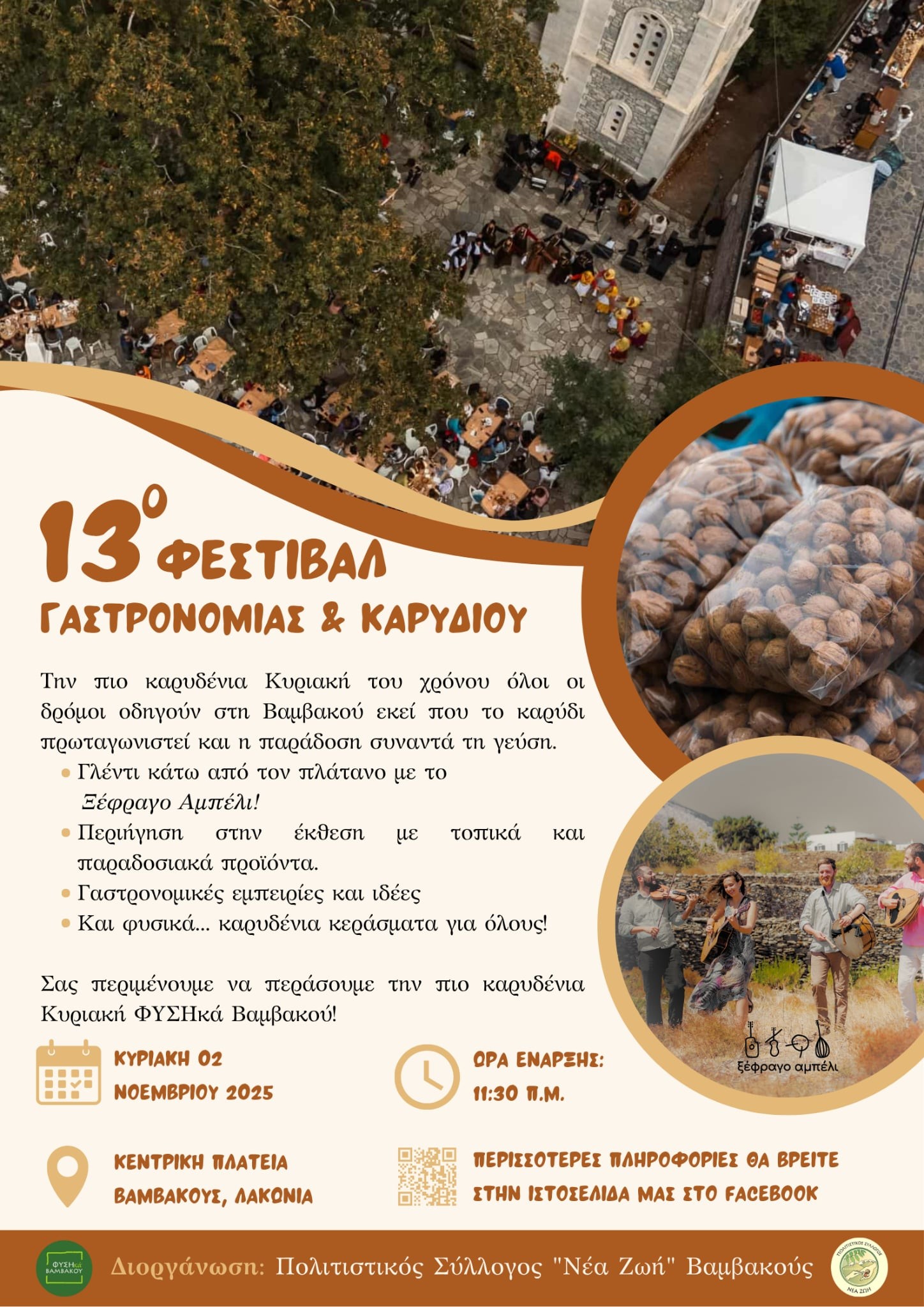 Όπως κάθε "καρυδένια Κυριακή", έτσι και φέτος, το καρύδι έχει την τιμητική του, πρωταγωνιστώντας σε παραδοσιακές συνταγές, γλυκίσματα, κεράσματα και δημιουργικές γαστρονομικές εμπνεύσεις. Η παράδοση συναντά τη γεύση, με τη φθινοπωρινή φύση της Βαμβακούς να προσφέρει το ιδανικό σκηνικό για ένα αξέχαστο αντάμωμα.