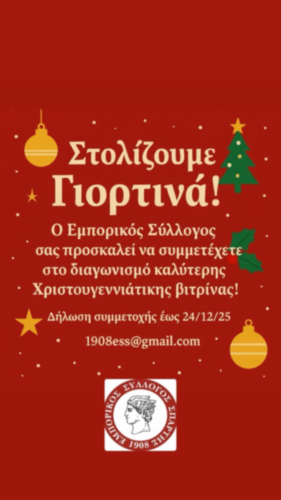 Οι τρεις επιχειρήσεις με την καλύτερη Χριστουγεννιάτικη βιτρίνα θα βραβευθούν στον ετήσιο χορό του Εμπορικού Συλλόγου Σπάρτης, που θα πραγματοποιηθεί στις 14 Φεβρουαρίου 2026 στο Ξενοδοχείο Mystras Grand Palace Resort & Spa.