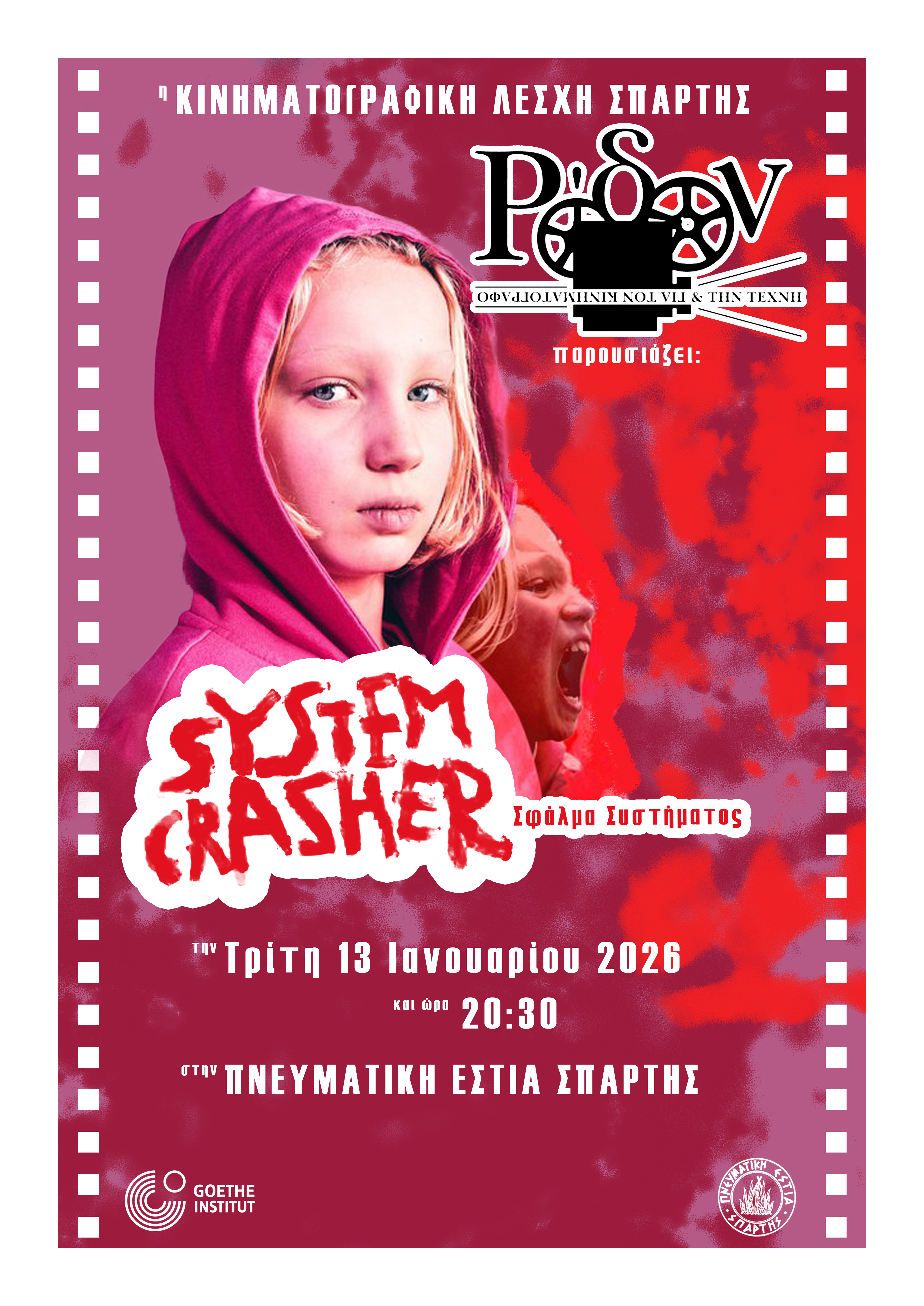 Η Κινηματογραφική Λέσχη Σπάρτης συνεχίζει το κινηματογραφικό της πρόγραμμα με μια ταινία που δεν αφήνει αδιάφορο κανέναν. Την Τρίτη 13 Ιανουαρίου, στις 20:30, στην Πνευματική Εστία Σπάρτης, οι θεατές θα έχουν την ευκαιρία να παρακολουθήσουν τη γερμανική ταινία του 2019 «Σφάλμα Συστήματος (System Crasher)», σε σκηνοθεσία της Νόρα Φίνγκσαϊντ.
