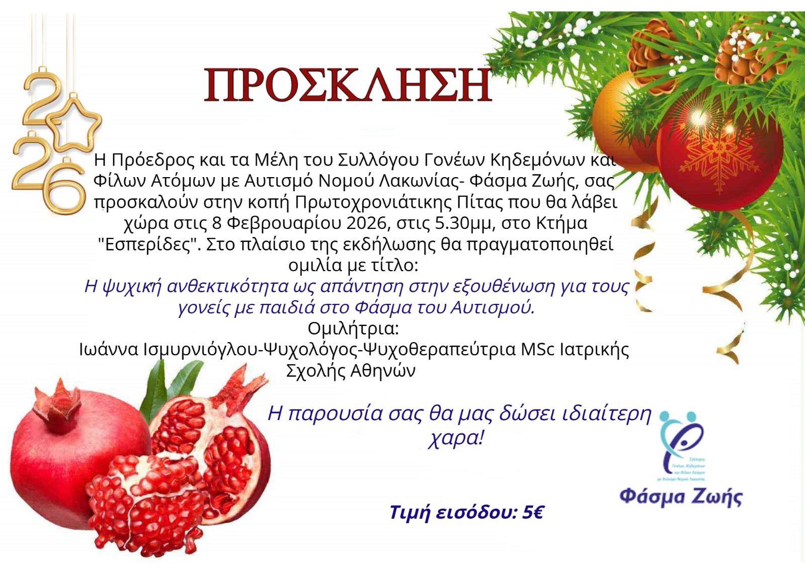 Την καθιερωμένη κοπή της πρωτοχρονιάτικης πίτας του συνδυάζει με μια επίκαιρη εκδήλωση ο Σύλλογος Γονέων, Κηδεμόνων και Φίλων Ατόμων με Αυτισμό Νομού Λακωνίας «Φάσμα Ζωής», την Κυριακή 8 Φεβρουαρίου, στις 5:30 το απόγευμα, στο Κτήμα «Εσπερίδες».