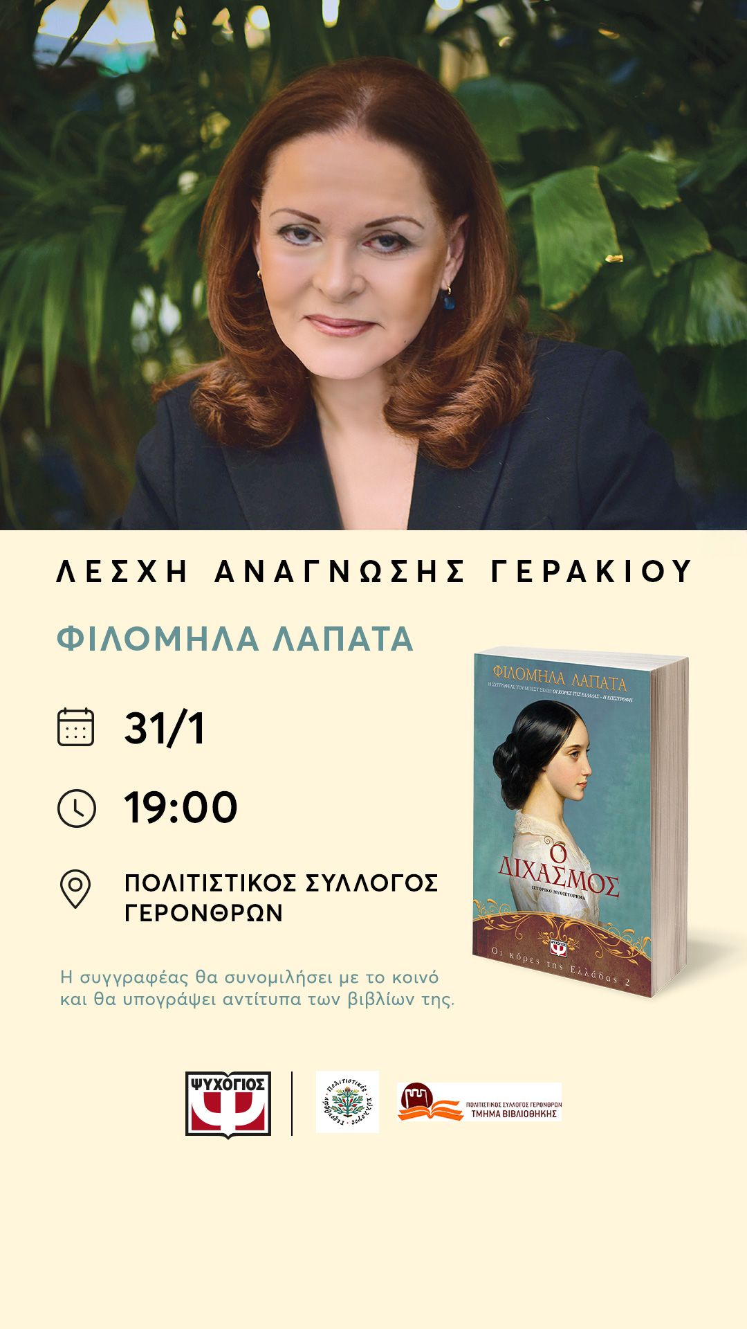 Μια ξεχωριστή λογοτεχνική βραδιά φιλοξενεί η Λέσχη Ανάγνωσης Γερακίου το Σάββατο 31 Ιανουαρίου, στις 19:00, στον χώρο του Πολιτιστικού Συλλόγου Γερονθρών, με αφορμή την παρουσίαση του βιβλίου «Ο Διχασμός» της συγγραφέως Φιλομήλας Λαπάτα.