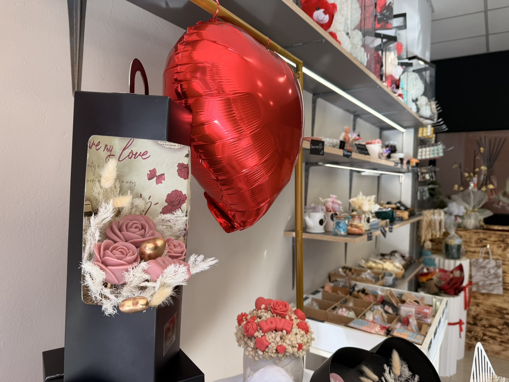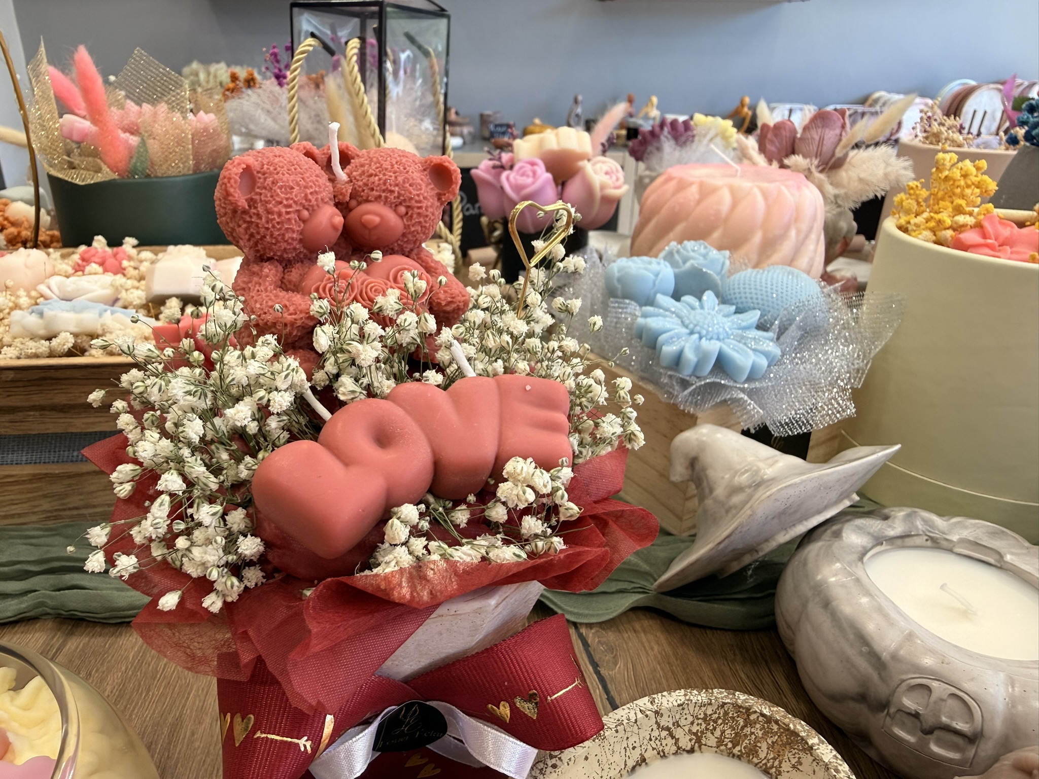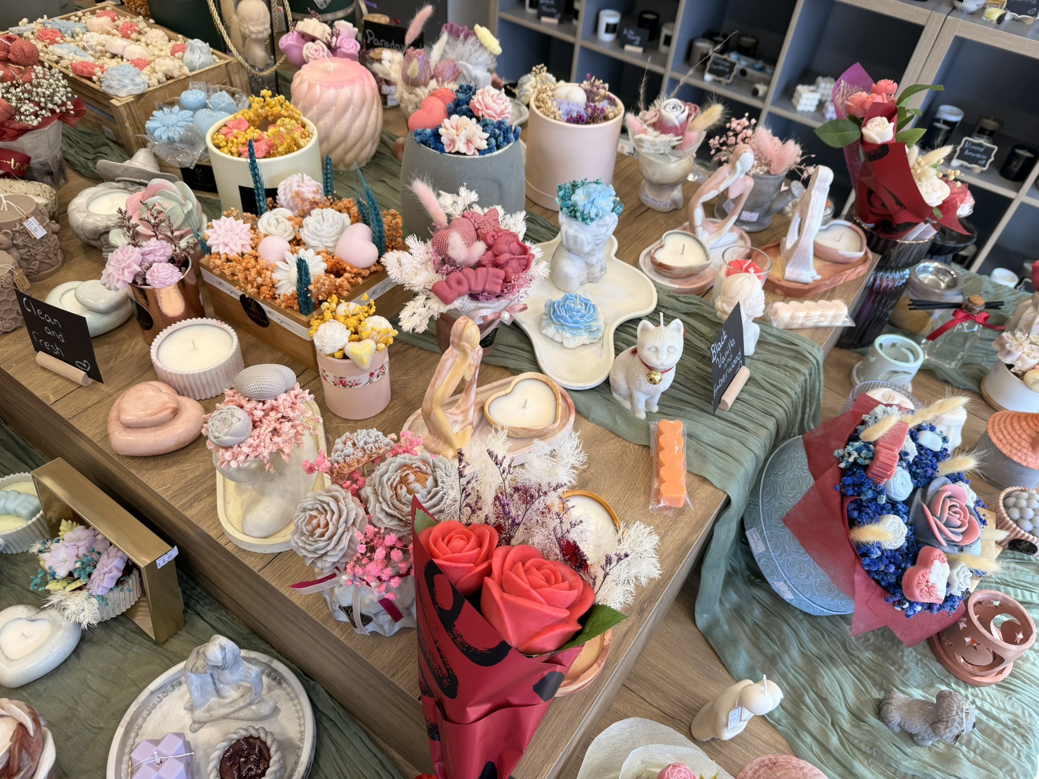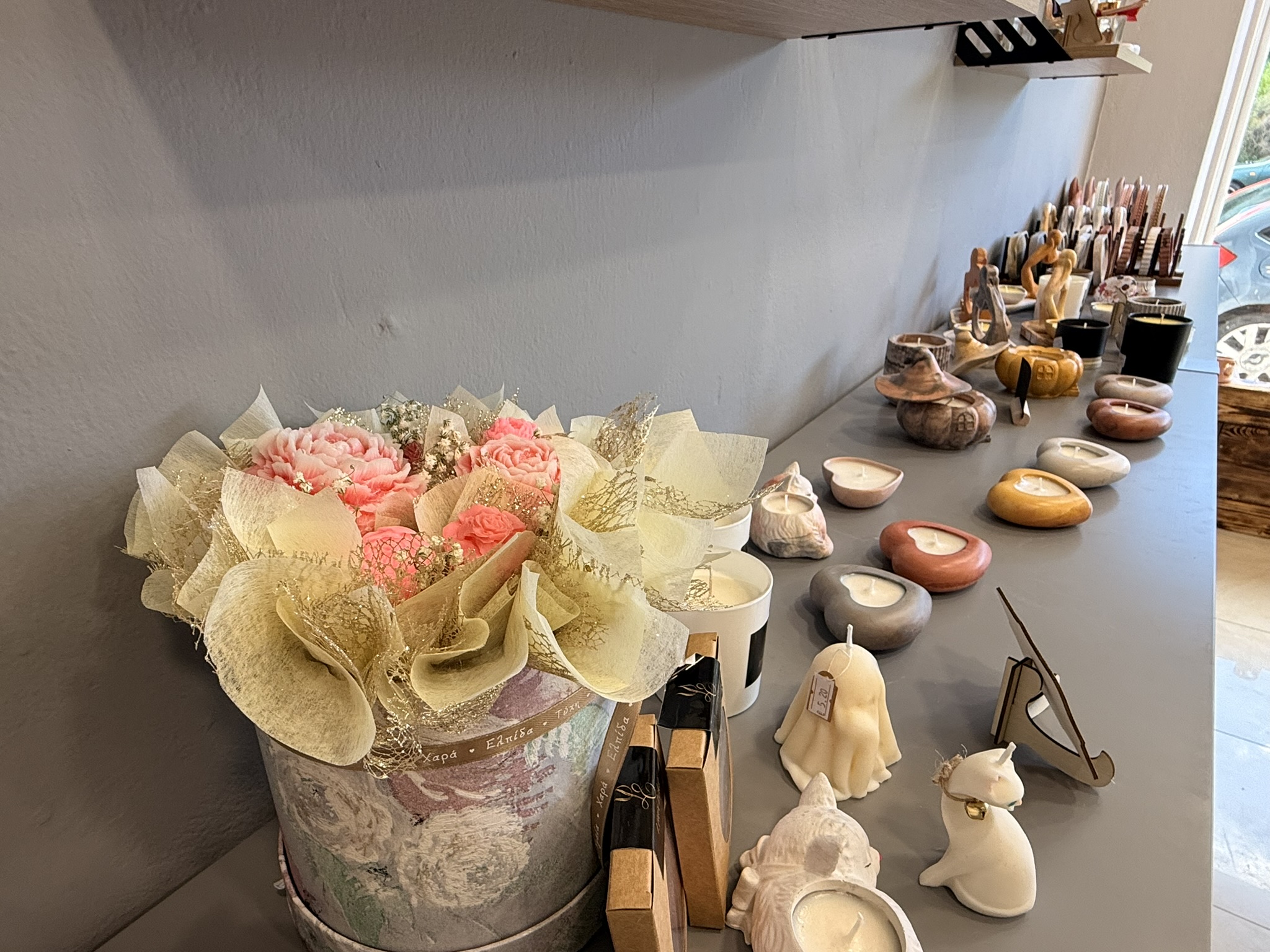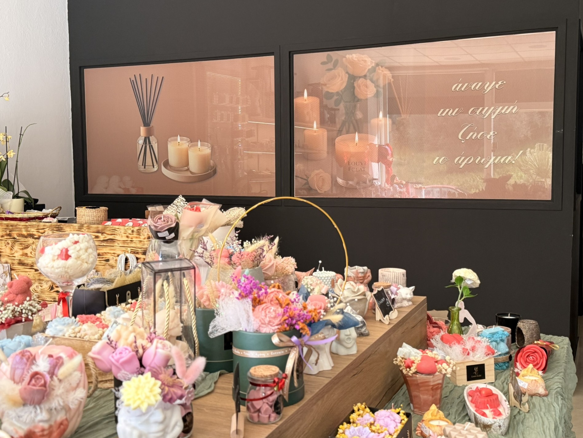 Μπαίνοντας στο κατάστημα, η πρώτη εντύπωση είναι η ζεστασιά και η φινέτσα του χώρου. Στην είσοδο σε καλωσορίζουν εντυπωσιακές συνθέσεις από κεριά και γύψινες κατασκευές, μικρά μπουκέτα με κέρινα λουλούδια και κομψές εποχιακές δημιουργίες. Τα αρώματα που αιωρούνται στον αέρα κάνουν αμέσως ξεχωριστή την εμπειρία: βανίλια, τριαντάφυλλο, κανέλα, φρέσκα λουλούδια ή πιο εξωτικά μείγματα –όλα επιλέξιμα ανάλογα με τη διάθεση ή την προσωπικότητα του παραλήπτη.