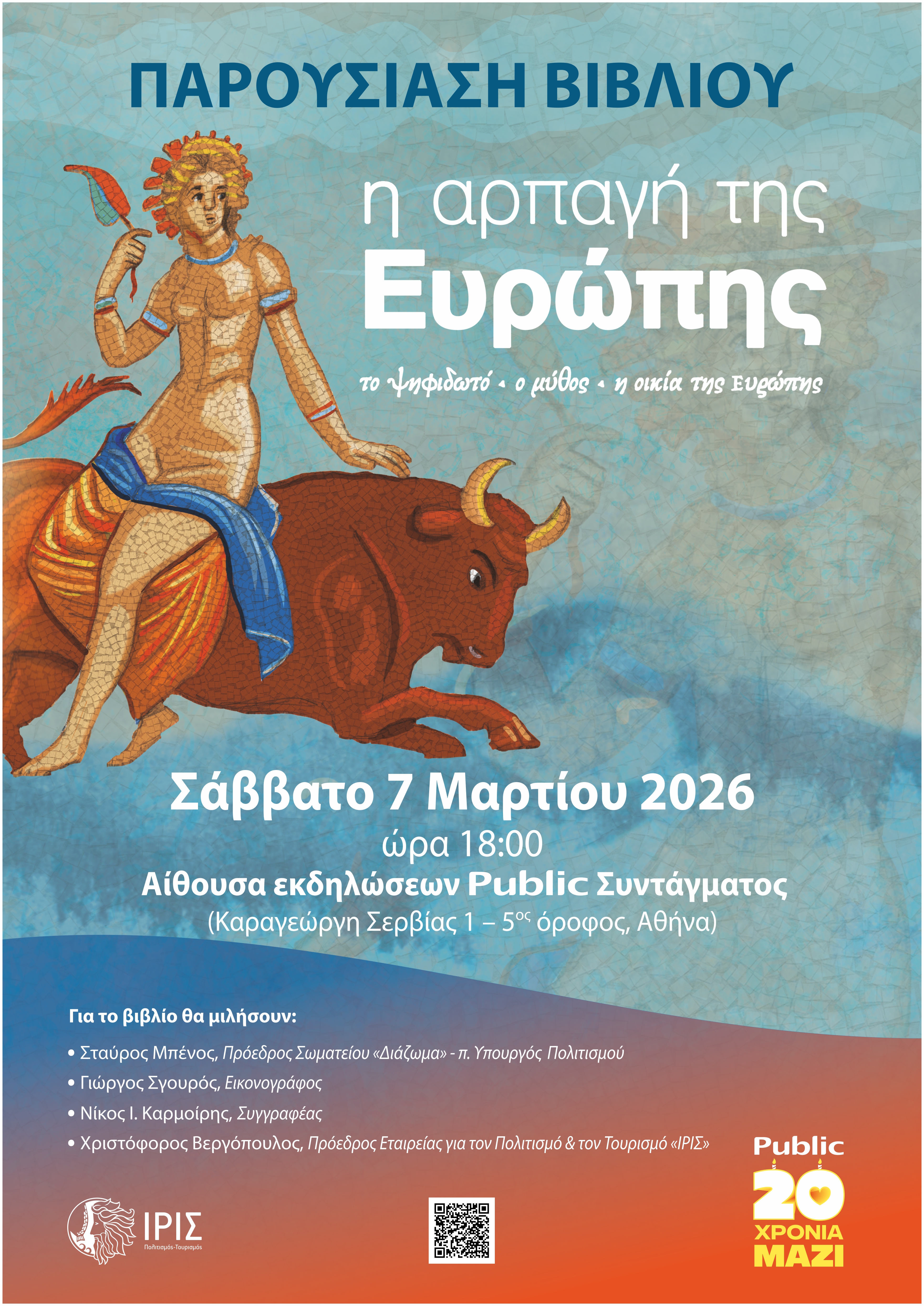 Το παιδικό – εφηβικό εικονογραφημένο βιβλίο «Η αρπαγή της Ευρώπης» του Νίκου Ι. Καρμοίρη (σε εικονογράφηση Γιώργου Σγουρού) παρουσιάζουν στην Αθήνα η Εταιρεία για τον Πολιτισμό & τον Τουρισμό «ΙΡΙΣ» και τα Public, το Σάββατο 7 Μαρτίου και ώρα 18:00, στην Αίθουσα Εκδηλώσεων του Public Συντάγματος (Καραγεώργη Σερβίας 1, 5ος όροφος).