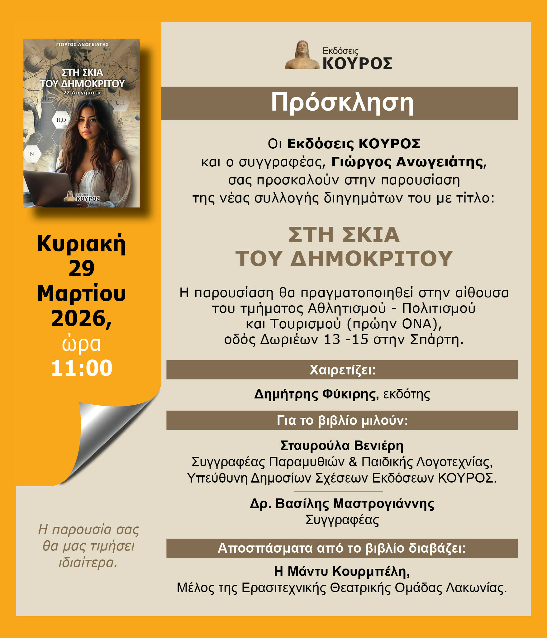 Η εκδήλωση διοργανώνεται από τις εκδόσεις Κούρος και θα πραγματοποιηθεί την Κυριακή 29 Μαρτίου στις 11:00 π.μ., στην αίθουσα του Τμήματος Αθλητισμού – Πολιτισμού και Τουρισμού (πρώην ΟΝΑ), στην οδό Δωριέων 13–15, στη Σπάρτη.