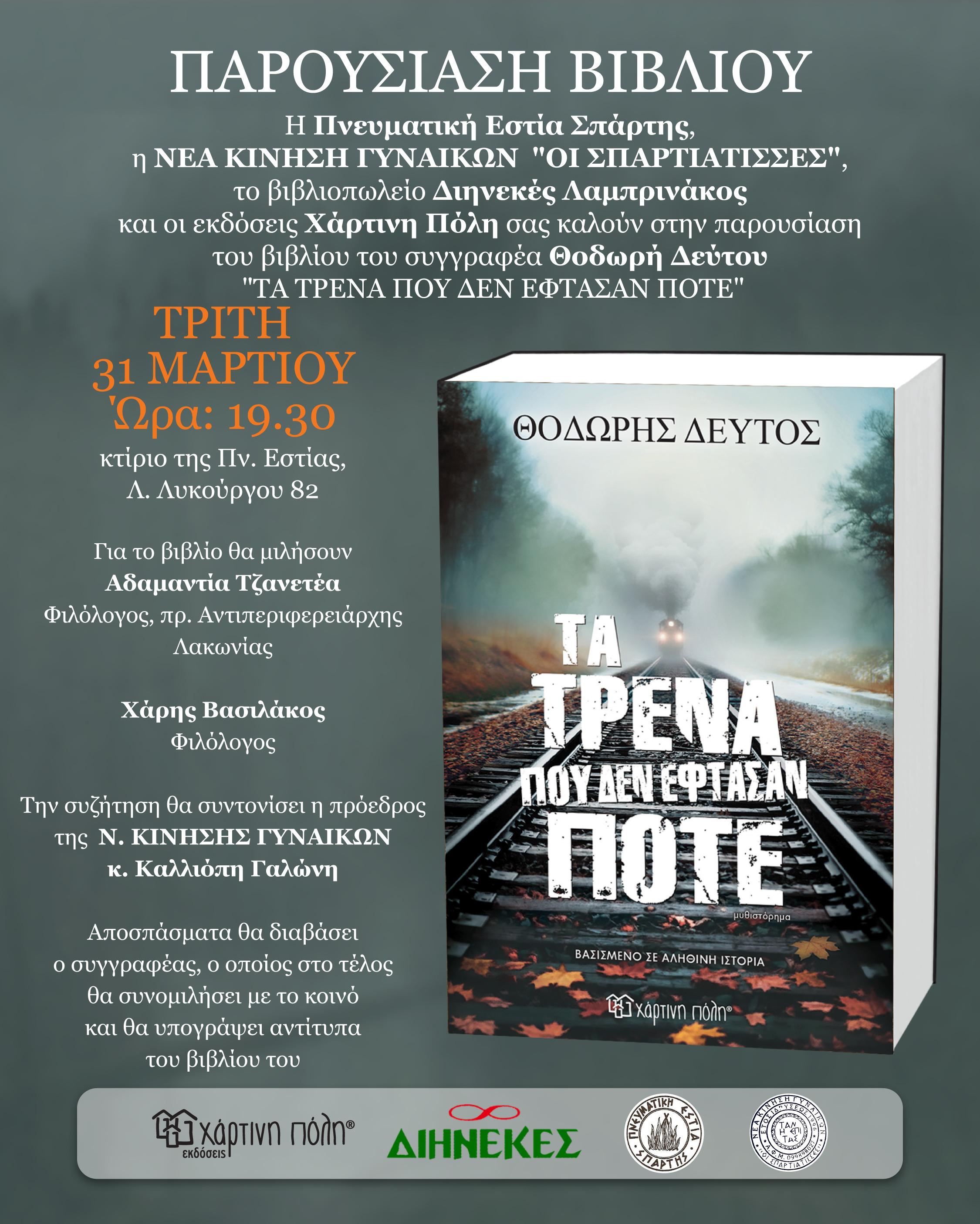 Μια ξεχωριστή λογοτεχνική βραδιά ετοιμάζεται να φιλοξενήσει η Σπάρτη, με αφορμή την παρουσίαση του νέου βιβλίου του συγγραφέα Θοδωρή Δεύτου, με τίτλο «Τα τρένα που δεν έφτασαν ποτέ». Η εκδήλωση θα πραγματοποιηθεί την Τρίτη 31 Μαρτίου, στις 7:30 το απόγευμα, στον φιλόξενο χώρο της Πνευματικής Εστίας Σπάρτης.