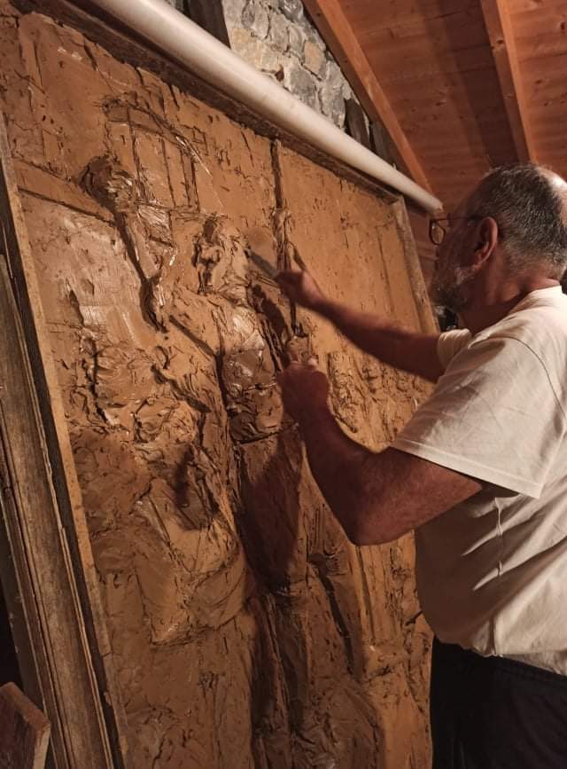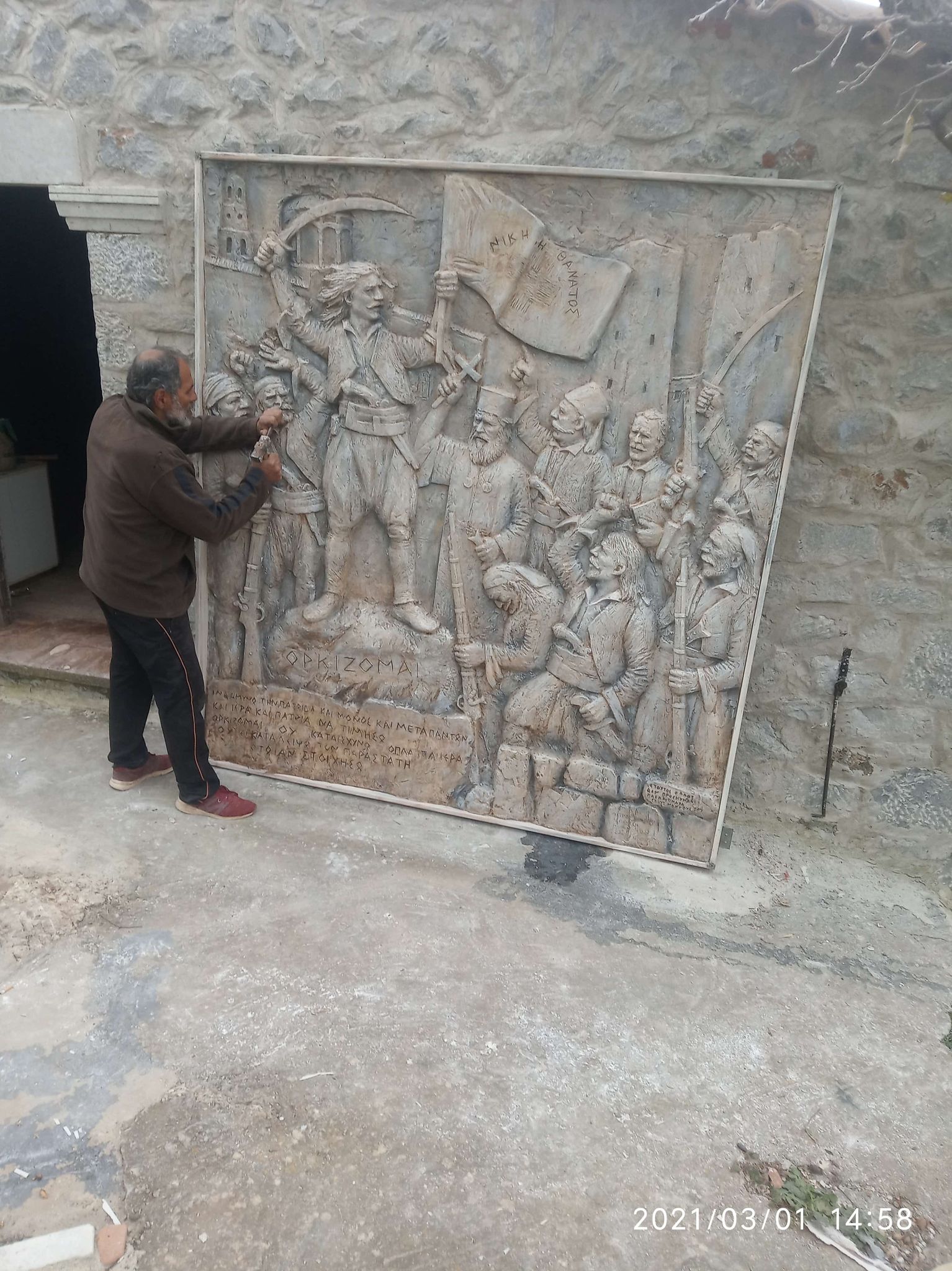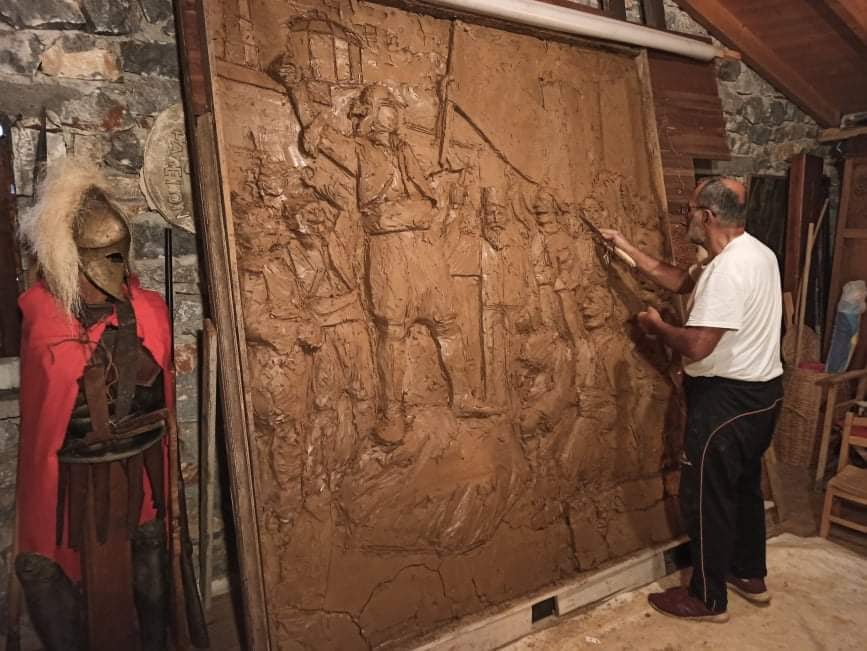 Για τη δημιουργία της αναπαράστασης, χρειάστηκε ασταμάτητη εργασία τεσσάρων μηνών από τον γλύπτη Πέτρο Γεωργαρίου, ο οποίος άρχισε να λαξεύει το μάρμαρο μόλις τον περασμένο Νοέμβριο, έπειτα από σχετική ανάθεση που του έγινε από το Δήμο Ανατολικής Μάνης. «Έμπνευση του έργου αποτέλεσε η ιστορία του τόπου μας», δηλώνει ο ίδιος μιλώντας στον «Λακωνικό Τύπο».