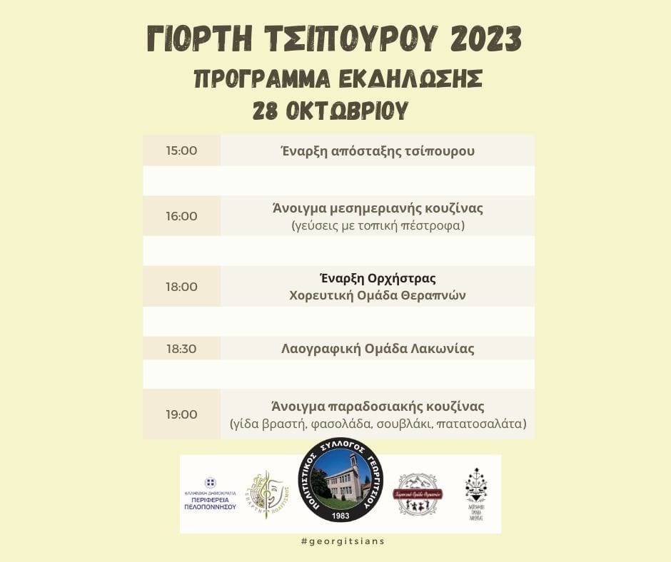 «Φέτος στις 28 Οκτωβρίου σας περιμένουμε όλους να ανταμώσουμε και να διασκεδάσουμε με ζωντανή μουσική, χορό, με τις παραδοσιακές μας γεύσεις αλλά και την προσθήκη νέων και φυσικά να πιούμε τα τσιπουράκια μας, τα οποία είναι παραγωγή μας, κάνοντας κέφι.», αναφέρει στο κάλεσμά του ο Πολιτιστικός Σύλλογος Γεωργιτσίου.