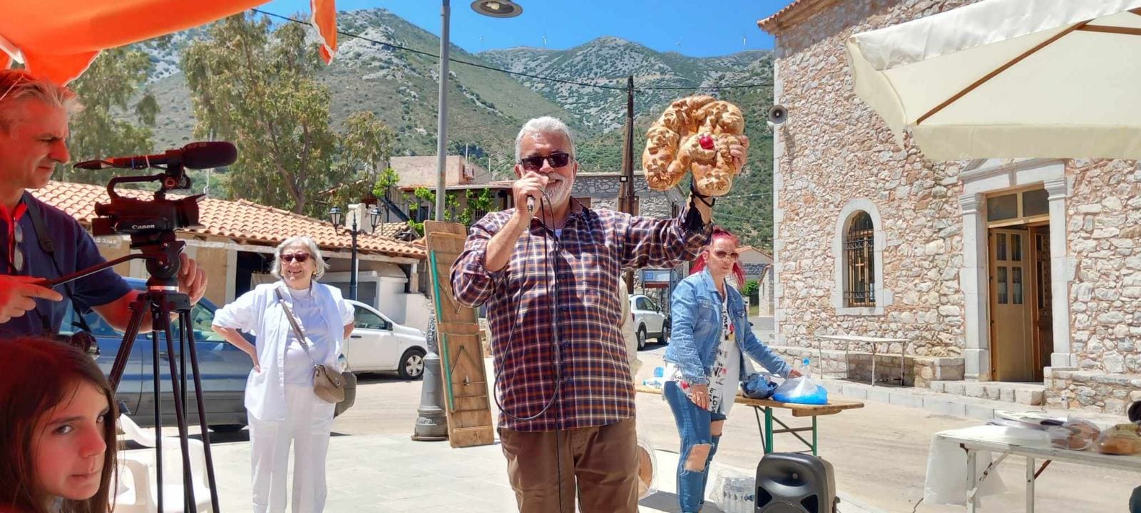 Ο δραστήριος Εκπολιτιστικός Σύλλογος Φλωμοχωριτών "Η Αγία Τριάς", με τον πρόεδρο του Χρήστο Μπουράνη και τα μέλη του ΔΣ, σε συνεργασία με τον άξιο εφημέριο π. Κωνσταντίνο Παντελεάκο, μετά την θεία λειτουργία και τη μετάβαση στο κοιμητήριο, μετά και την λιτανεία στο χωριό, μάς προσκάλεσαν το μεσημέρι στην μεγάλη πλατεία για εκδήλωση που σχετιζόταν με την ιστορική και λαογραφική προσέγγιση τού παλαιότατου μανιάτικου εθίμου "του Σταυρού". Εθίμου που αναζωπυρώθηκε στις μέρες μας, με την συνδρομή και τής γνωστής συμπατριώτισσάς μας συγγραφέως Ελένης Τζικάκου, η οποία είχε προετοιμάσει σε συνεργασία με τις Μανιάτισσες και τους Μανιάτες κάθε ηλικίας, ντόπιους και αποδήμους, την παρασκευή των εντυπωσιακών παραδοσιακών λαμπροκουλούρων, αλλά και τη δική μου, για μια αναφορά στο ιστορικό πλαίσιο, αλλά και την έκτακτη δημοπρασία που ακολούθησε!...