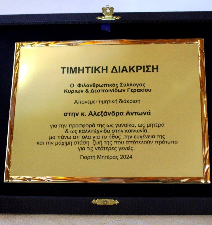 Ο Φιλανθρωπικός Σύλλογος Κυριών και Δεσποινίδων Γερακίου ευχαριστεί την Αλεξάνδρα Αντωνά, «για την τιμή να παραβρεθεί στην εκδήλωση, αλλά και για την προσφορά ενός πίνακα με θέμα “Μητέρα και Παιδί”, που δώρισε στον σύλλογο». Επίσης, απευθύνει ευχαριστίες «στον Θανάση Γρεβενίτη, αντιδήμαρχο Δήμου Ευρώτα, τη δημοτική σύμβουλο Νίκη Θεοδωρακάκου του Γεωργίου, το μέλος του ΤΣ της Κοινότητας Γερακίου, Αργυρούλα Γιάννε, τα ΔΣ όλων των συλλόγων του χωριού για την παρουσία τους, όλους τους παριστάμενους, καθώς και τις κυρίες που βοήθησαν στην επιτυχία της, Ευαγγελία Κοντογεώργου, Ρένα Σκουλαρίνα, Νίκη Θεοδωρακάκου του Παναγιώτη και τον Χρήστο Μπαλαμπάνο για τις φωτογραφίες και τα βίντεο». Η εκδήλωση έκλεισε με προσφορά χειροποίητων γλυκισμάτων από μέλη του συλλόγου, που ευχήθηκαν «χρόνια πολλά σε όλες τις μανούλες!».