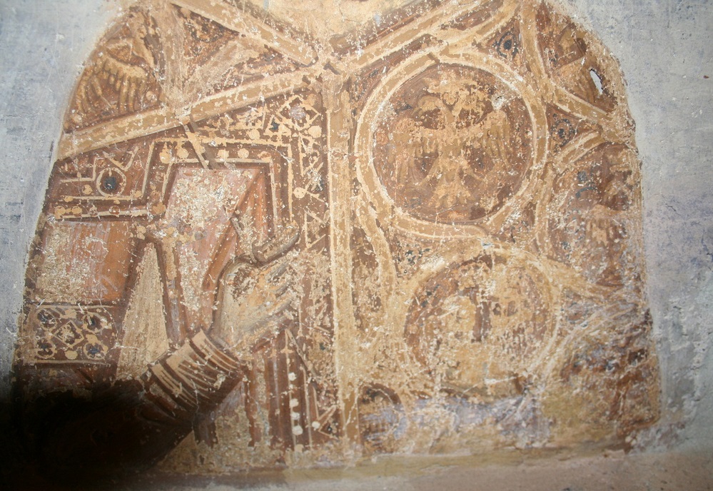 Στην τοιχογραφία απεικονίζεται η μορφή ενός ώριμου άνδρα που φέρει αυτοκρατορικά 'διάσημα' (πολυτελή λώρο πάνω από τον ανοιχτόχρωμο σάκκο, διάλιθο στέμμα) και κρατά σταυροφόρο σκήπτρο. Ο χρυσοκέντητος πορφυρός του μανδύας διακοσμείται με μετάλλια, στα οποία εγγράφονται δικέφαλοι αετοί με στέμμα ανάμεσα στις κεφαλές τους, διακριτικό των μελών της οικογένειας των Παλαιολόγων. Η παρουσία των δικέφαλων αετών στο ένδυμα της μορφής, σε συνδυασμό με τα υπόλοιπα insignia, αποτελούσαν ένα εικονογραφημένο μήνυμα που επέτρεπε στον θεατή να ταυτοποιήσει αδιαμφισβήτητα τον άντρα με αυτοκράτορα.