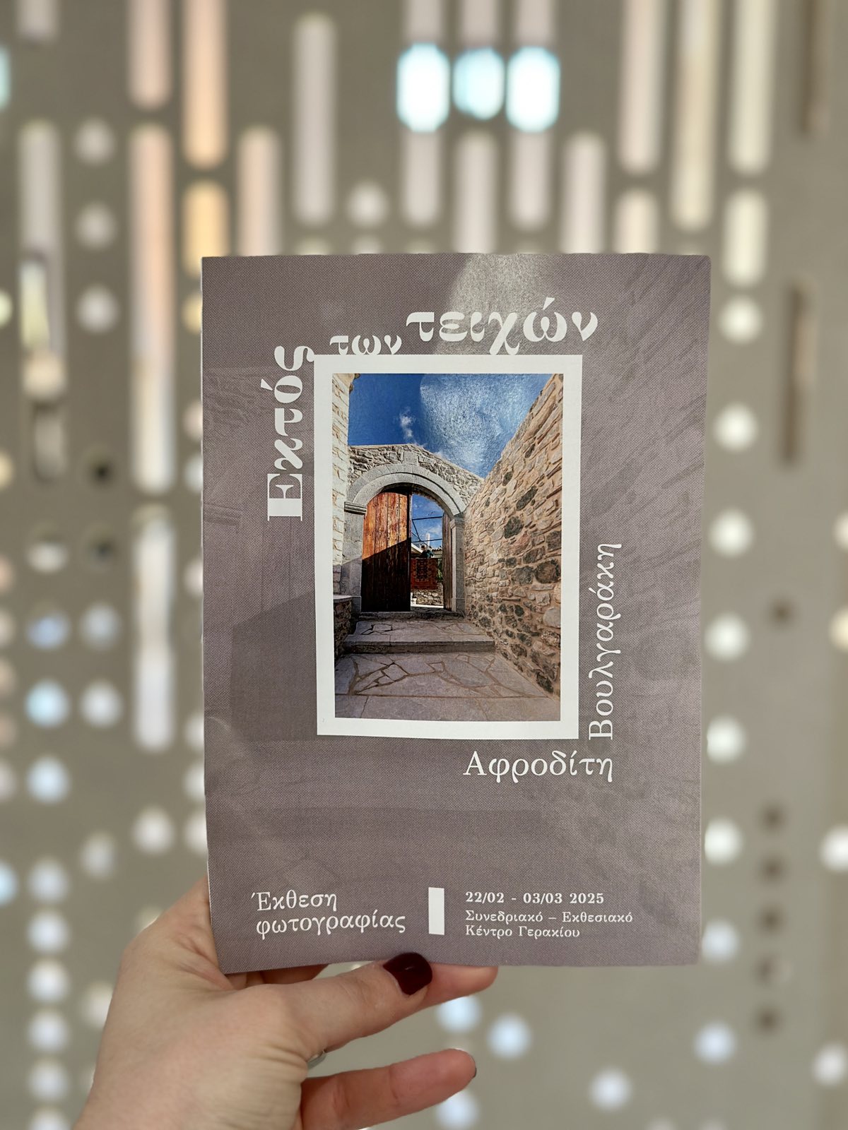 Παράλληλα εγκαινιάστηκε η έκθεση φωτογραφίας της Αφροδίτης Βουλγαράκη, με τίτλο «Εκτός των Τειχών», που παρουσιάζει στιγμιότυπα από την καθημερινή, αγροτική ζωή, με μια σειρά φωτογραφιών τοποθετημένες σε ειδικά φωτισμένους αργαλειούς. Επίσης, σε έναν τεράστιο «αργαλειό», που φτιάχτηκε με 9 χιλιόμετρα νήμα υφαντικής, προβλήθηκε ένα βίντεο που συνδυάζει και προβάλλει την τέχνη της Υφαντικής και την καθημερινότητα στο γεράκι. Την έκθεση προλόγισε ο αρχειονόμος/ιστορικός, Μιχάλης Σόβολος. Σημειώνεται ότι η Αφροδίτη Βουλγαράκη είναι δασκάλα στο Δημοτικό Σχολείο Γερακίου κι εκτός, από το εκπαιδευτικό της έργο, αρέσκεται να απαθανατίζει στιγμές από την κοινωνική ζωή του Γερακίου σε διάφορες εκφάνσεις της.