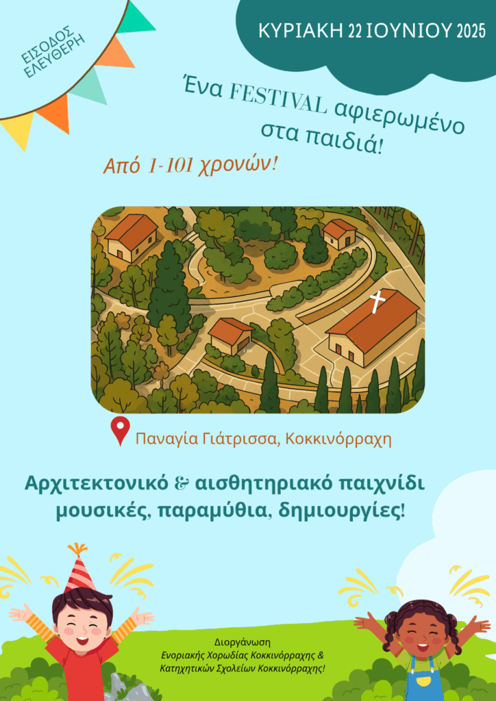 Η Ενορία Κοκκινόραχης διοργανώνει ένα πρωτότυπο ολοήμερο Φεστιβάλ, την προσεχή Κυριακή 22 Ιουνίου στον προαύλιο χώρο του ΙΝ Παναγίας Γιάτρισσας, με στόχο την ένωση των γενεών μέσα από τη μουσική, το παιχνίδι και την κοινότητα.