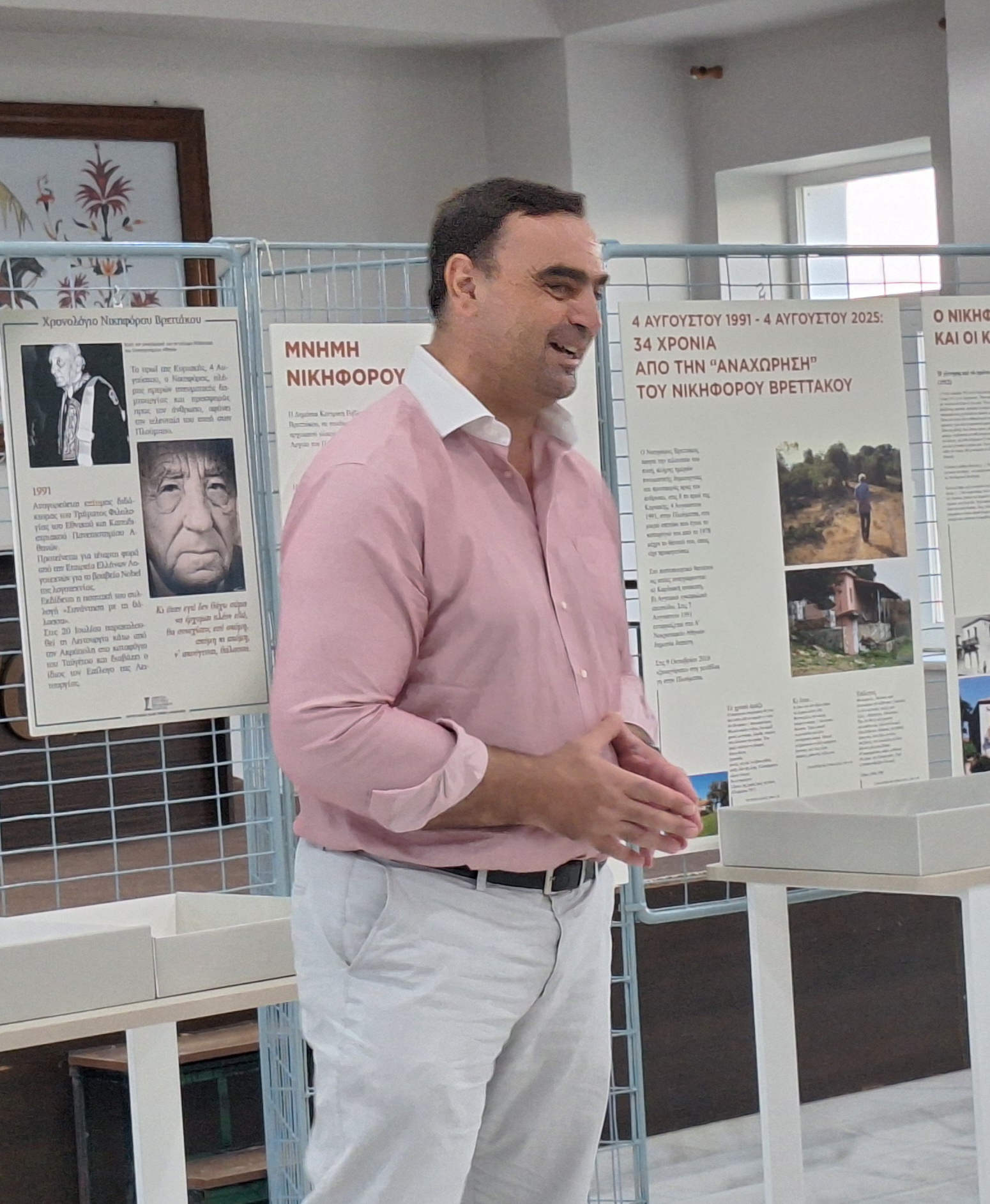 «Όταν μιλάμε για τον Νικηφόρο Βρεττάκο, αναφερόμαστε σε έναν φωτισμένο άνθρωπο, ταυτισμένο όσοι λίγοι με την λακωνική γη, που κατάφερε τον προσωπικό του διάλογο με τον Ταΰγετο, τα σιωπηλά βράχια και τη φύση της Λακωνίας, να τον μετουσιώσει σε ένα πανανθρώπινο μήνυμα. Μέσα από τα γραπτά και την ποίησή του, ανέδειξε αυτό που είχε μέσα του: Την μεγάλη του αγάπη για τον άνθρωπο. Γι’ αυτό και κάθε εκδήλωση μνήμης και τιμής, όπως η σημερινή έκθεση συνεισφέρει πραγματικά στο να διατηρούμε και εμείς ζωντανή τη μνήμη αυτού του τόπου. Του τόπου που τον γέννησε και τον μεγάλωσε για να μεταφέρει αυτό το πανανθρώπινο μήνυμα.