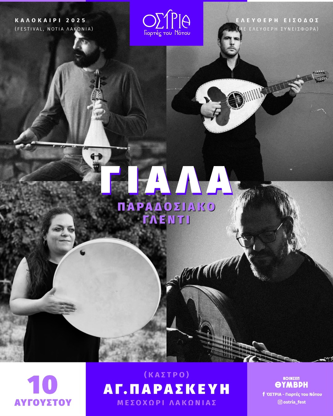 Στο πλαίσιο του πολιτιστικού φεστιβάλ «Όστρια – Γιορτές του Νότου», τη μουσική σκυτάλη θα πάρει το ξεχωριστό κρητικό μουσικό σχήμα «Γιάλα» (Giala Music Band), το οποίο ανηφορίζει την Κρήτη, φέρνοντας μαζί του τον αυθεντικό ήχο και τη μουσική ψυχή του νησιού. Θα ερμηνεύσουν αγαπημένα τραγούδια, τόσο της σύγχρονης ελληνικής δημιουργίας, όσο και παραδοσιακά από όλη τη χώρα και ιδιαίτερα από την Κρήτη, προσαρμόζοντάς τα στο δικό τους μοναδικό ήχο και τη δική τους αισθητική.